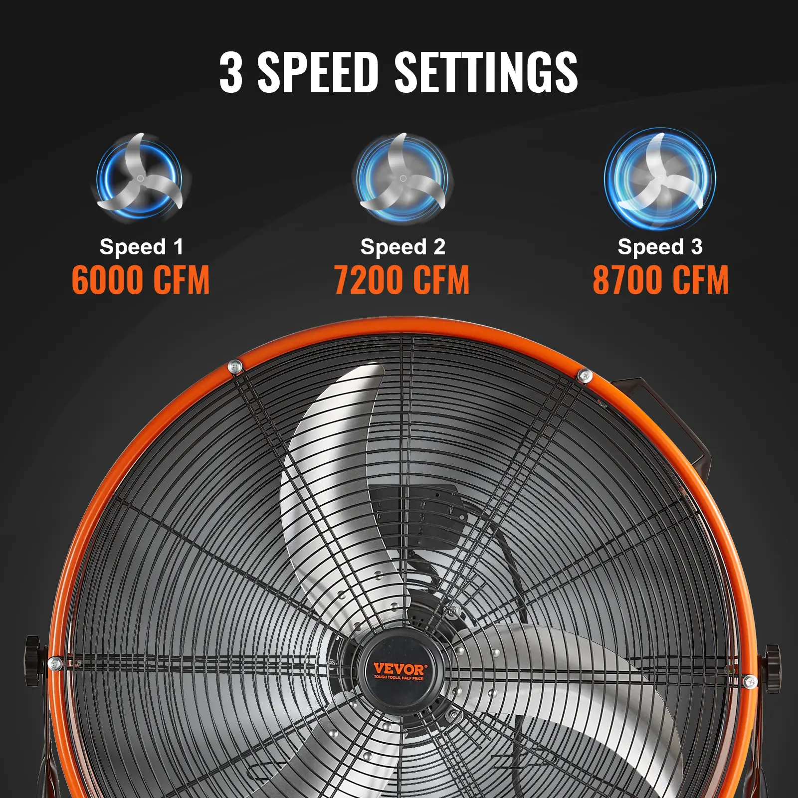 • 3 Speed Settings: With three speed options and a maximum airflow of 8700 CFM, this industrial floor fan easily handles dust removal, cooling, and air exchange.