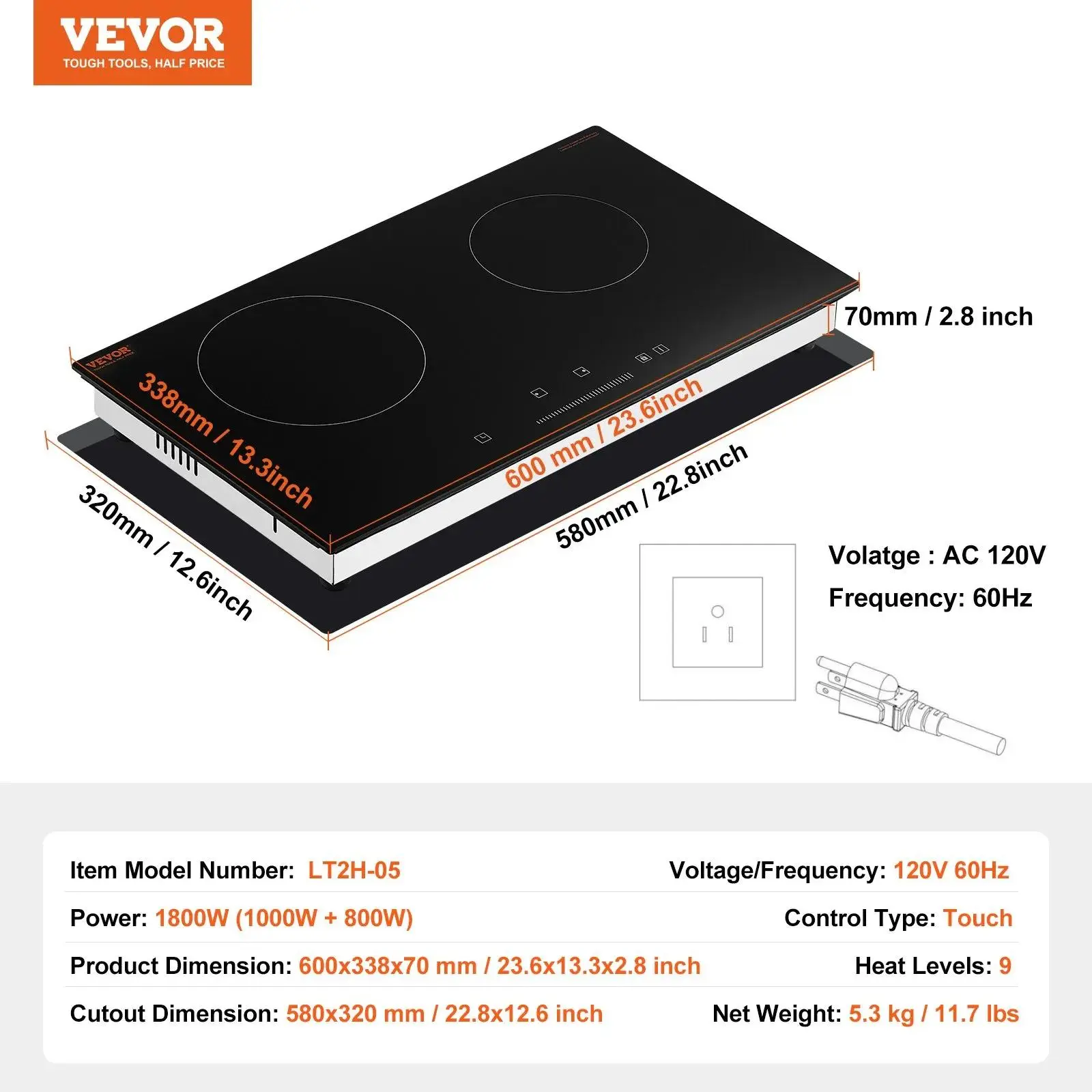 ·Space-SavingThe 24-inch cooktop features a built-in design, saving kitchen space. It is compatible with 120V, 60Hz voltage. The installation dimensions are 580x320 mm / 22.8x12.6 inch.