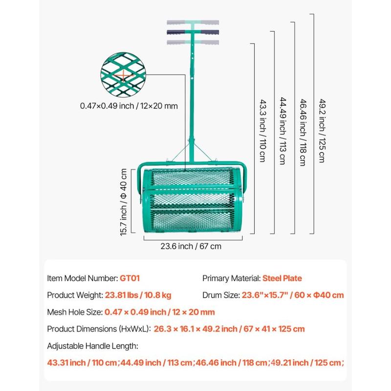 VEVOR 24 Compost Spreader Peat Moss Spreader Push/Tow - Behind Lawn Roller GreenVEVOR Compost Spreader, 24 in Wide Peat Moss Spreader with Push/Tow Handle, 4 Heights Adjustable, Powder-Coated Steel Garden Peat Moss Roller, Heavy Duty Grass Seed Spreaders for Planting Seeding Efficient Spreading Adjustable Handle for All Heights Built to Last Longer Quick Fertilizing Setup Large Capacity Drum Push or Tow—Your Choice Adjustable Handle Length: 43.31 inch / 110 cm,