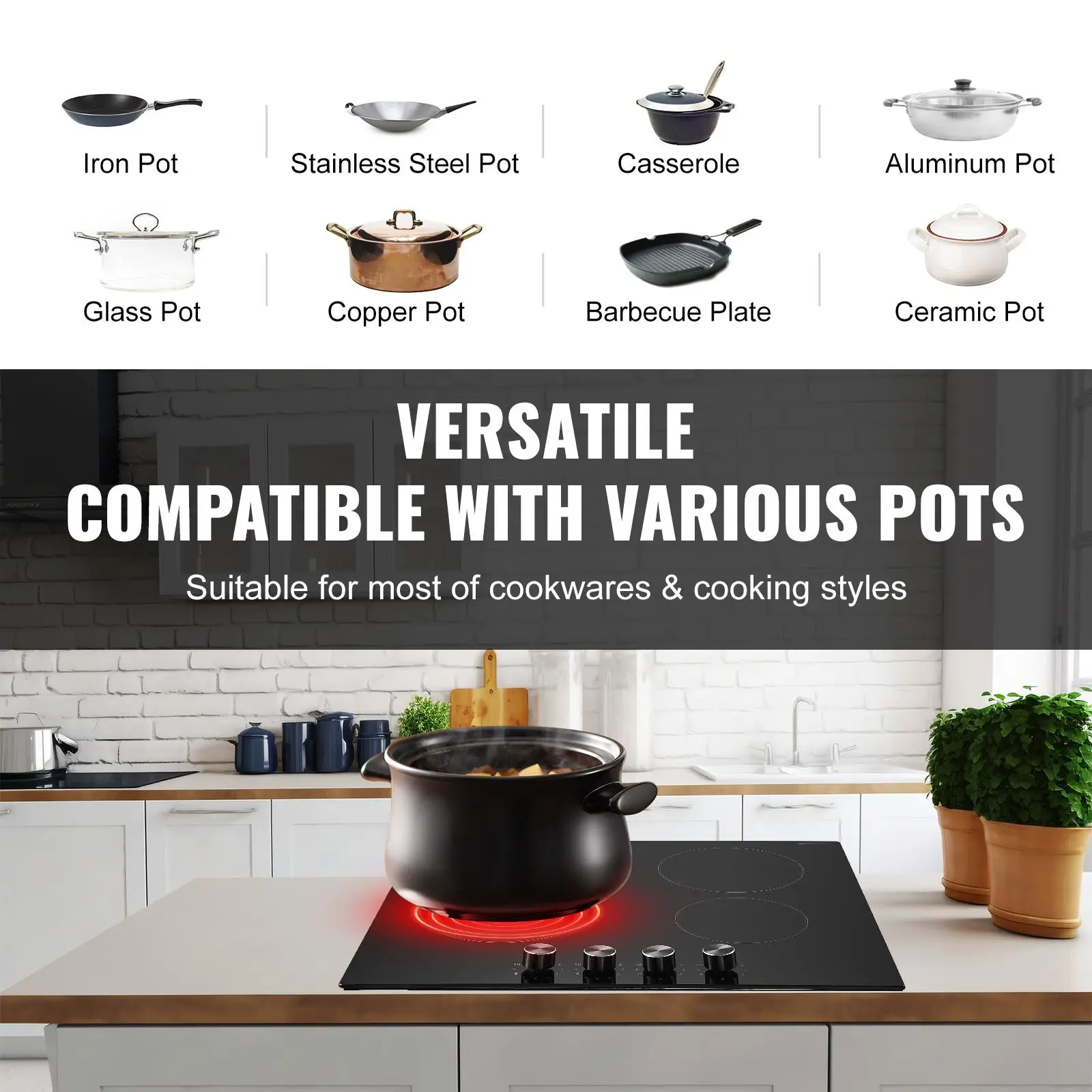• 4 Burners for Multi-Pot Cooking: The stovetop electric cooktop has 4 separate heating zones, allowing you to cook different dishes quickly at the same time. It is compatible with various high-temperature cookware, such as copper pots, cast iron skillets, and stainless steel pots. Cooking with multiple burners simultaneously is more efficient, reducing heat loss.