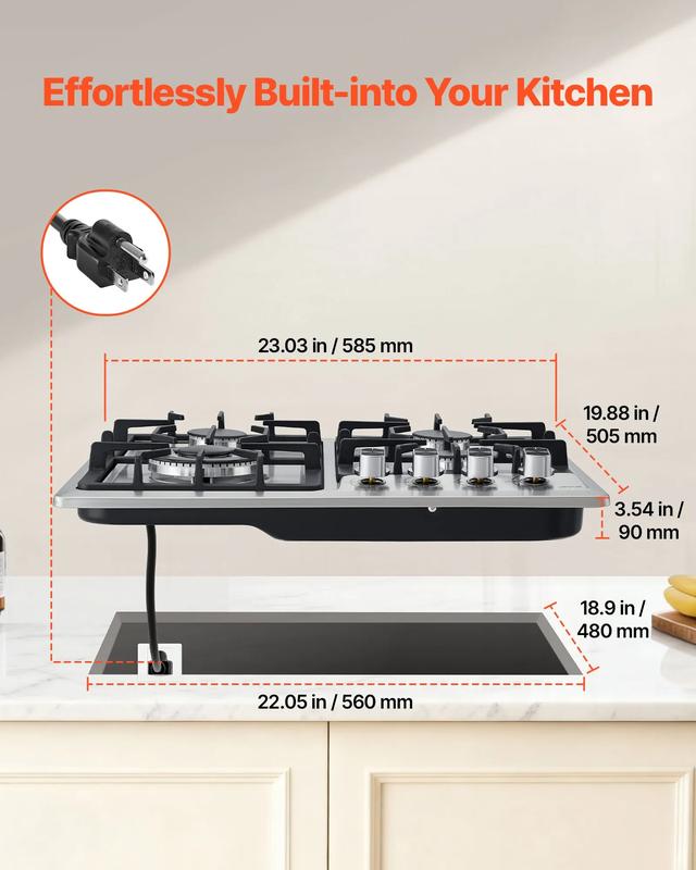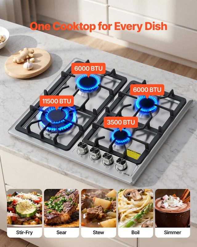·Thoughtful Daily Design: This VEVOR gas stove top uses sealed burners to limit spill entry, and its stainless panel wipes clean with ease. Removable cast-iron grates help reduce buildup, while heavy cast supports and zinc-alloy knobs offer steady hold and a smooth, heat-ready turn