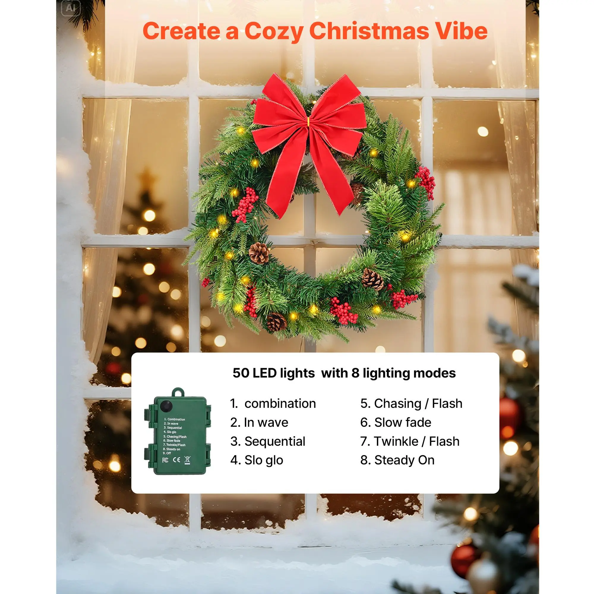 • Pre-Lit with LEDs: The wreath comes with 50 warm white LEDs and 8 light modes. It includes a built-in timer that runs 6 hours on and 18 hours off daily. 🌟
