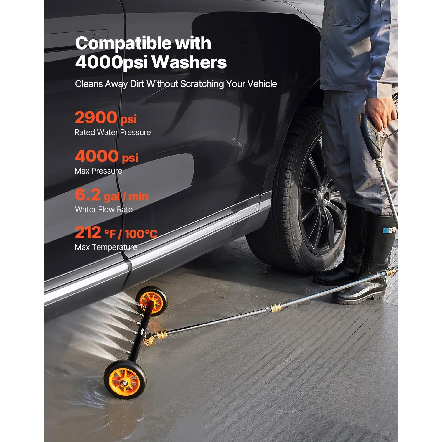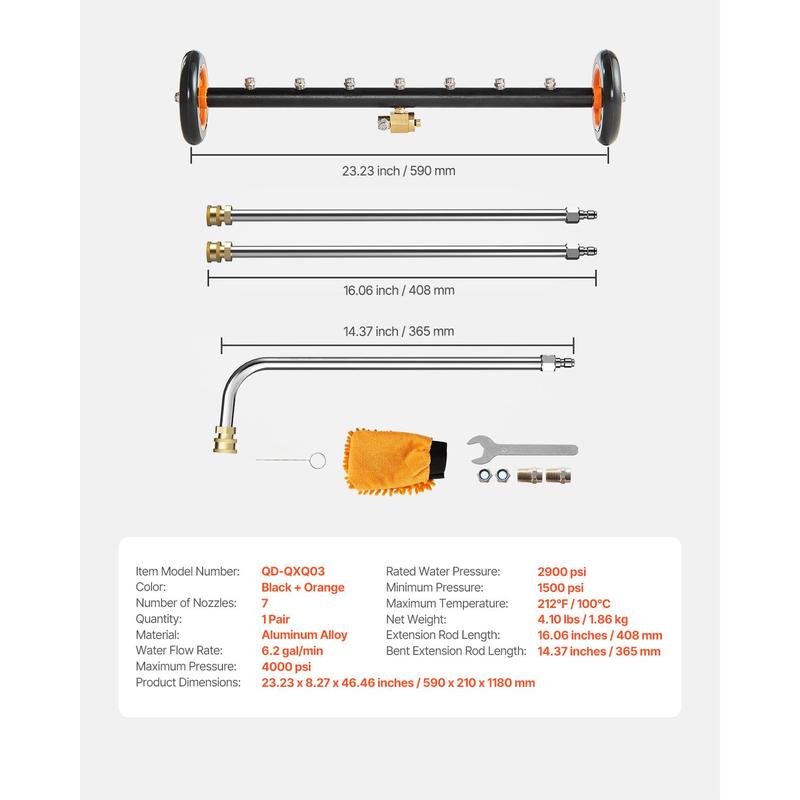·4000 PSI High Water Pressure: With a rated water pressure of 2900 PSI and a maximum pressure of 4000 PSI, this power washer surface cleaner can handle hot water up to 100°C, making it ideal for winter cleaning. It quickly removes dirt and debris without damaging your vehicle’s undercarriage.