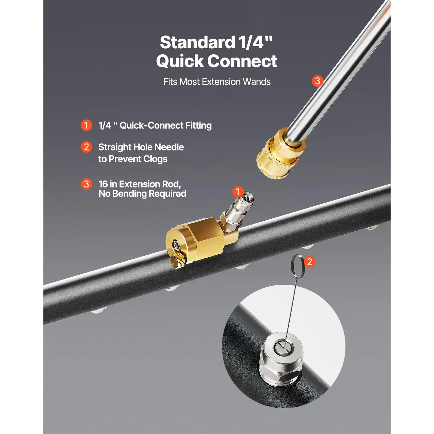 ·1/4" Quick Connect: Equipped with a standard 1/4-inch quick connect for seamless attachment. The connector is durable and secure, and won’t come loose. The 16-inch extension rod lets you clean without bending over, making the task more comfortable.