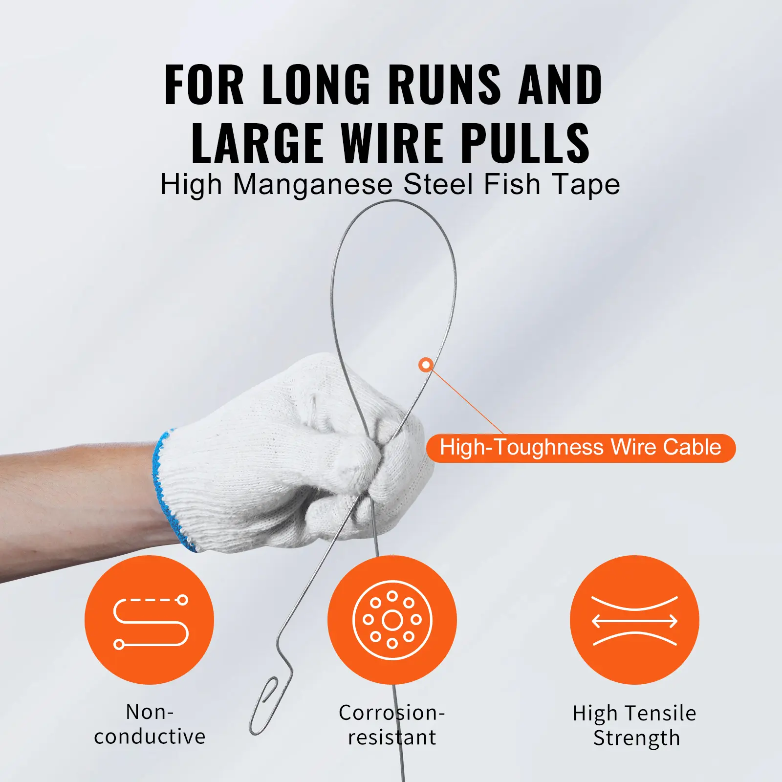 • Premium Wire Material: Made of high-manganese steel, it's a dream come true for those hefty cables. Boasting a length of 240 feet and a diameter of 1/8 inch, this fish tape takes on 90° bends without breaking a sweat. Talk about wear-resistant and stretch-savvy!