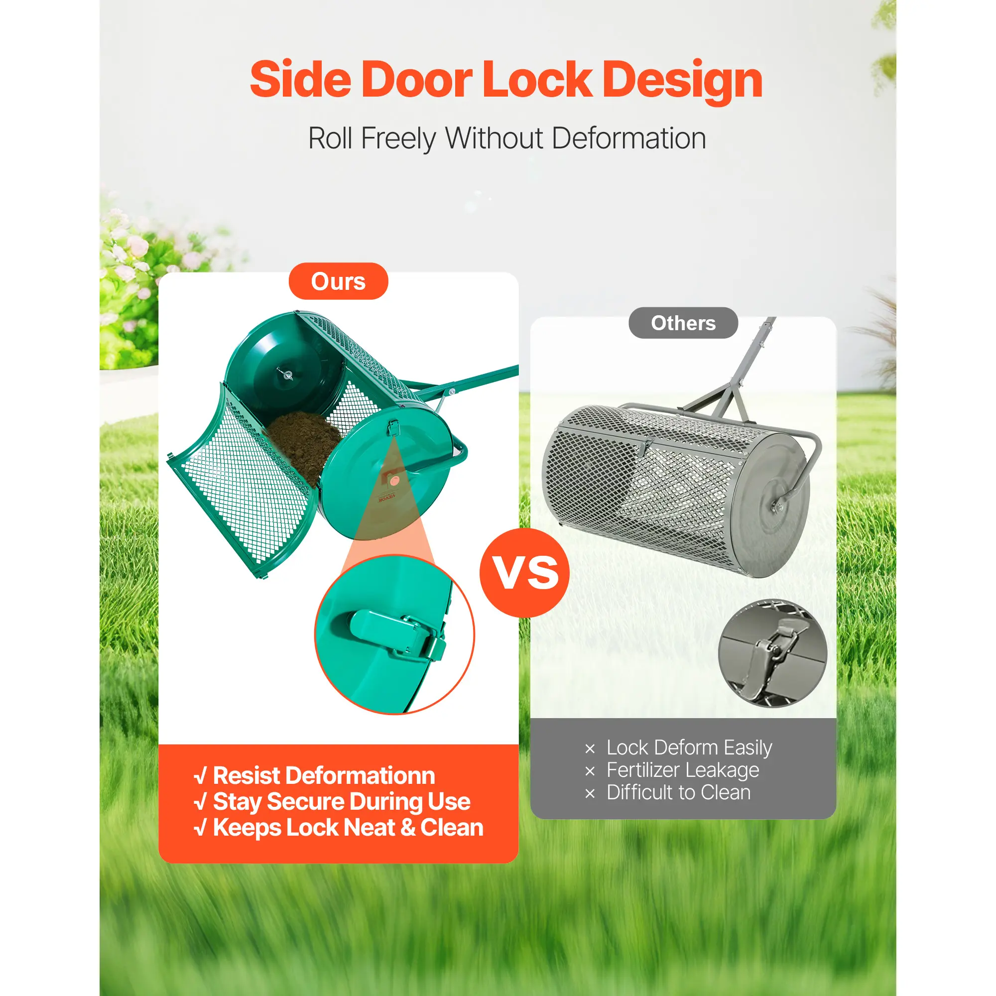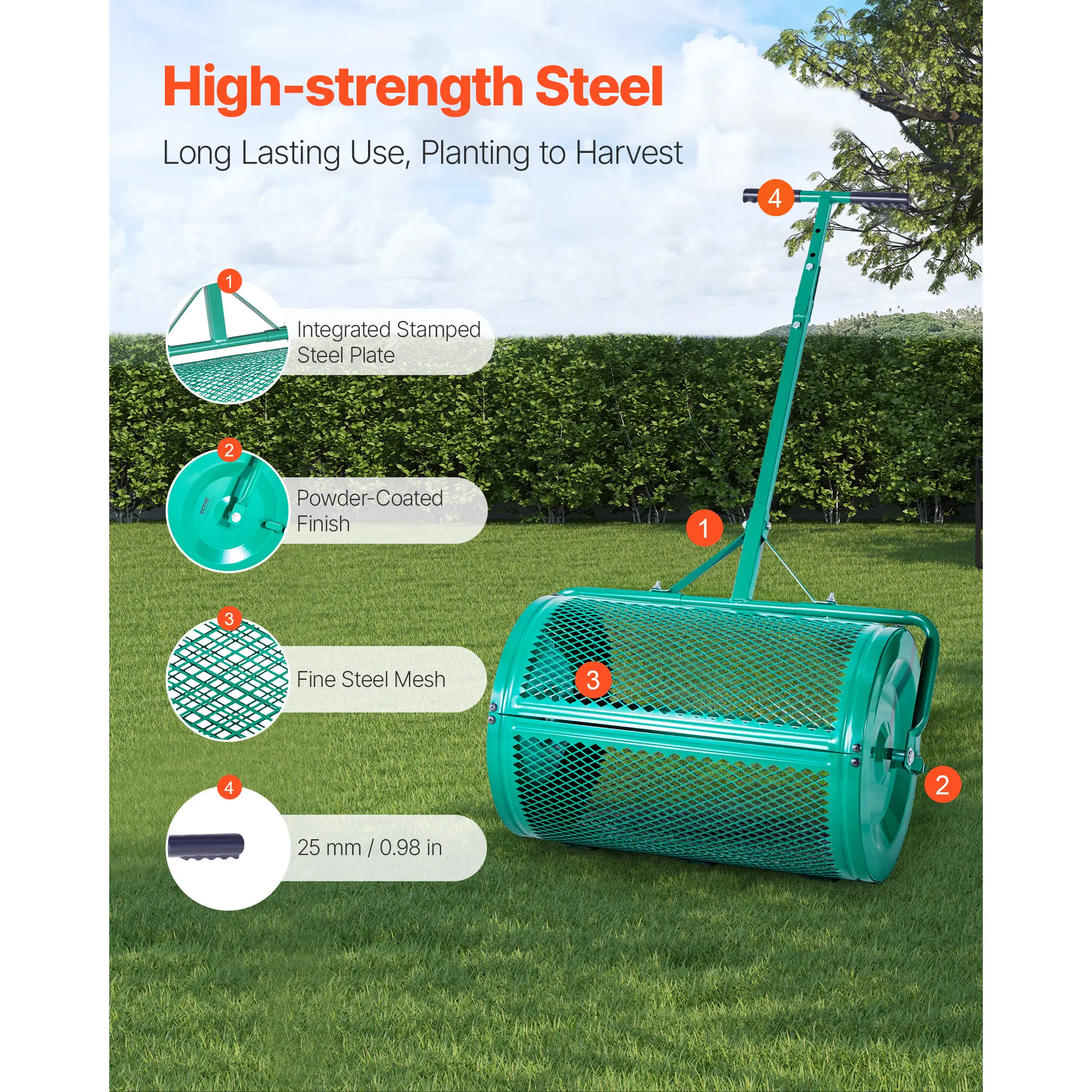 • Large Capacity Roller: This 24-inch peat moss roller holds up to 2.66 cu.ft of material, reducing the need for frequent refills. Fill it once with grass seed, fertilizer, or soil amendments to complete large jobs faster and with less effort