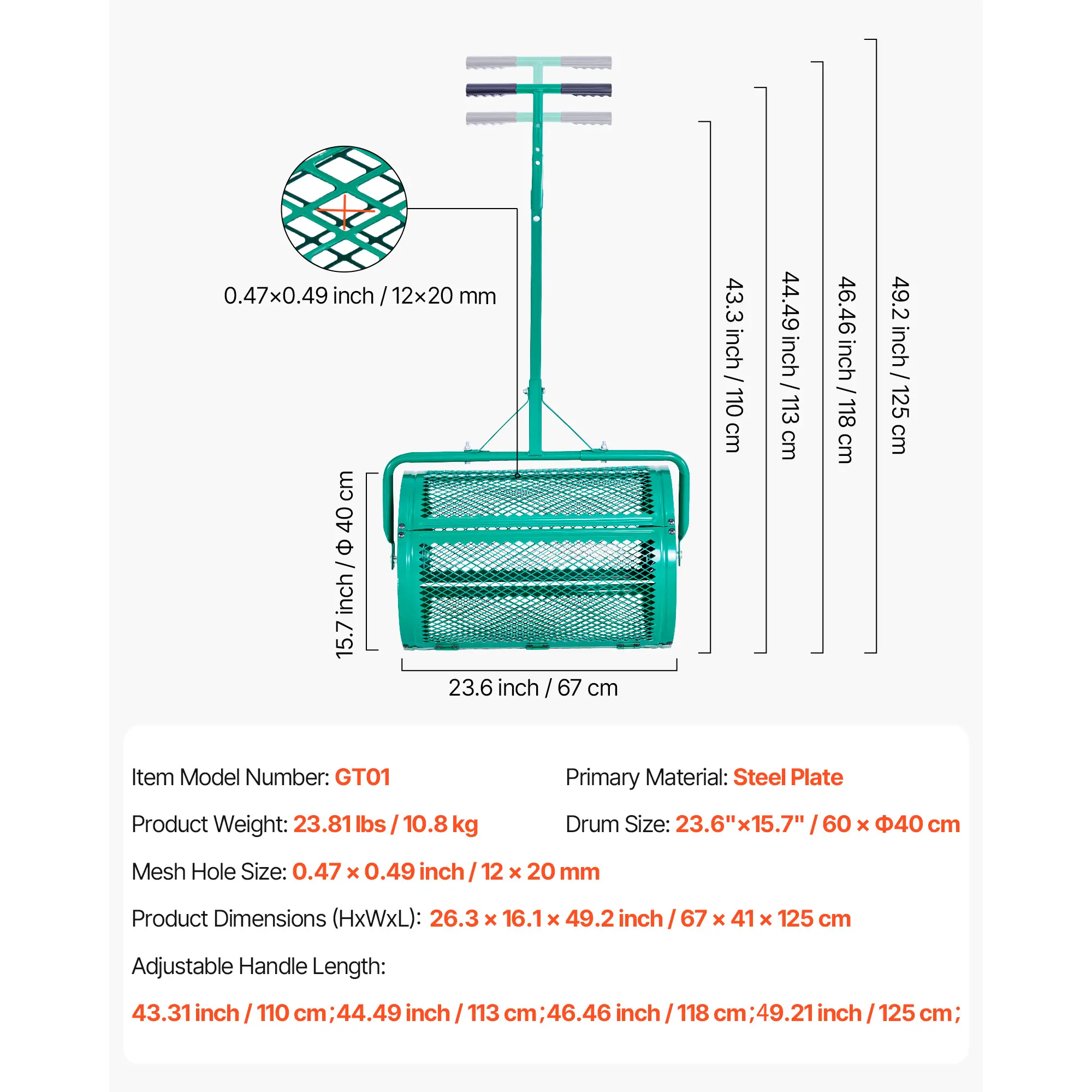 • Dual-Purpose Push/Tow Handle: This compost spreader features a push and tow handle for flexible use. Manually push for precise small-area tasks, or connect it to a trailer for efficient large-area spreading. The handle offers 4 adjustable heights (43.31 / 44.49 / 46.46 / 49.21 inch), making it more comfortable for users of different heights