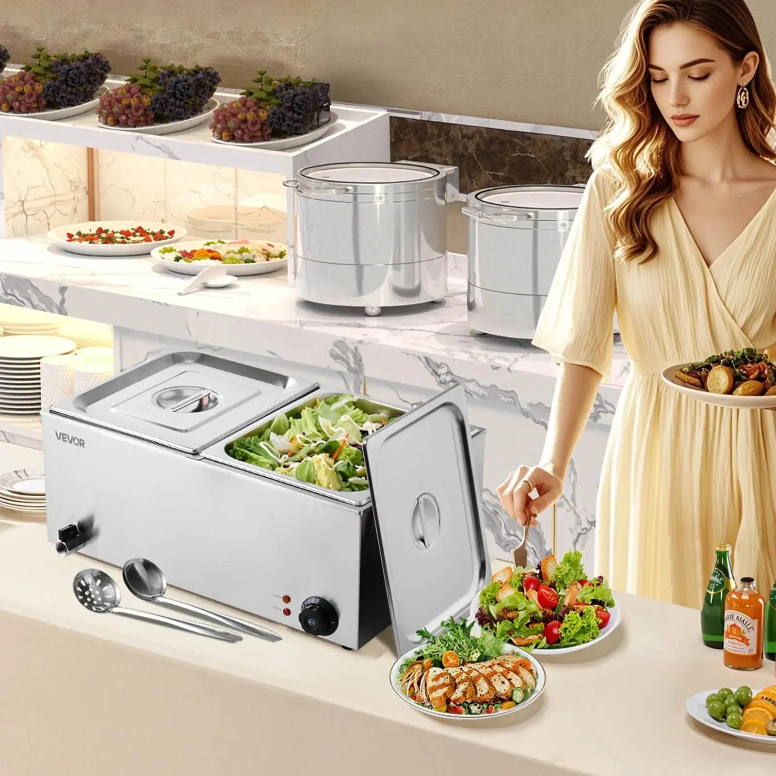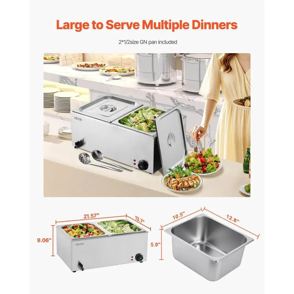 Elevate your catering and buffet setups with the VEVOR 24QT Commercial Food Warmer. This 1200W electric steam table features a stainless steel design, perfect for restaurants and parties. It includes a 3-pan capacity, ensuring ample space for food. The unit offers precise temperature control between 86-185°F, maintaining food quality. Ideal for commercial use, it's a reliable choice for busy catering professionals.