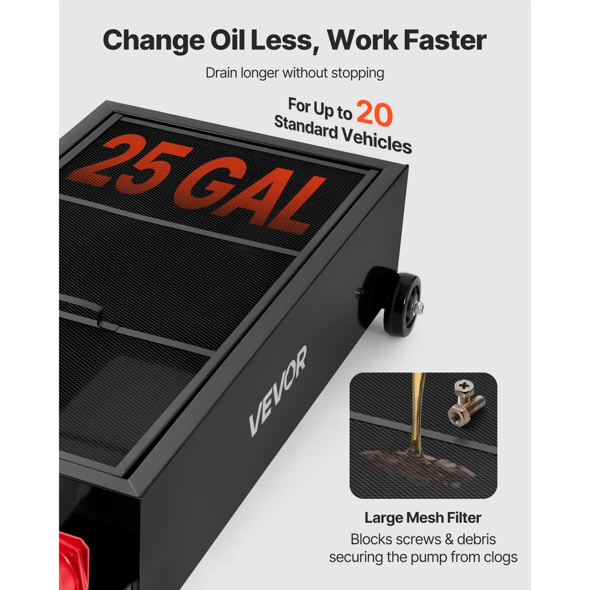 • Durable Steel Build: The reinforced carbon steel body handles heat and heavy use with ease. A large mesh filter of the portable oil drain pan blocks debris, securing the pump and helping extend service life