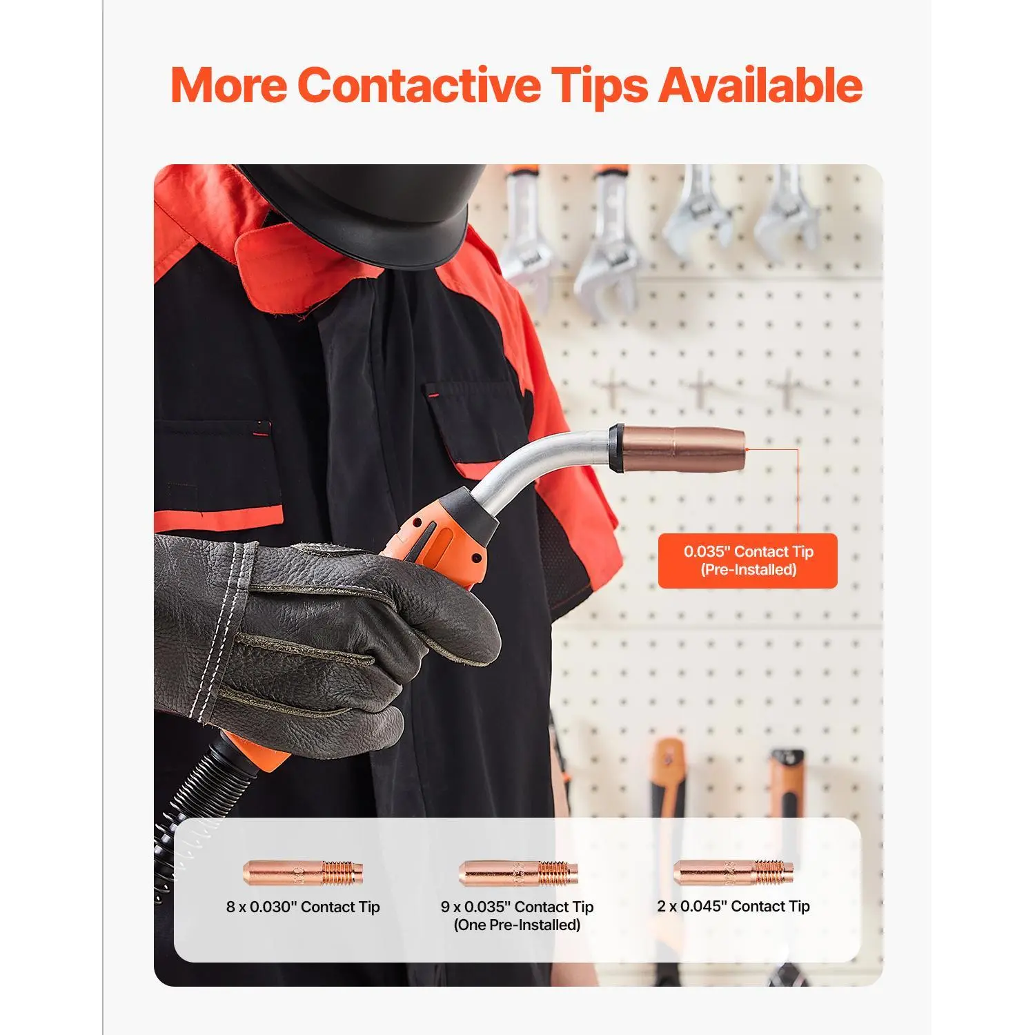 • Abundant Contact Tips: Pre-installed with one 0.035" contact tip, the package also includes additional 8PCS x 0.030" tips, 8PCS x 0.035" tips, and 2PCS x 0.045" tips, allowing for quick replacements and versatility across various welding tasks.
