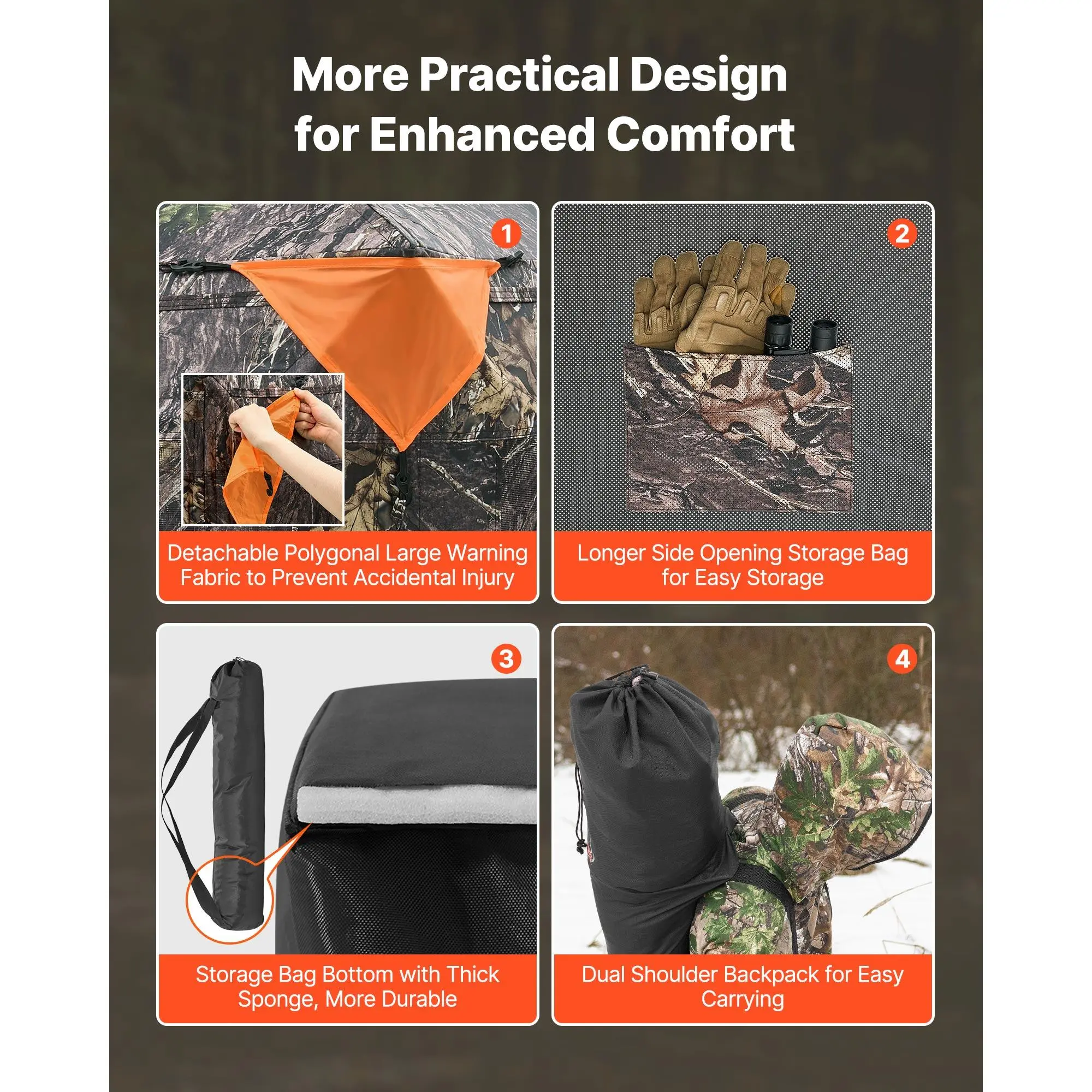 • Spacious Design: Dimension: 71x71x69 in. With large interior, our turkey deer blind tent can accommodates 4-5 people. Diamond-pattern warning fabric is detachable to increase visibility. It provides standing experience, 270°/360° two-way view