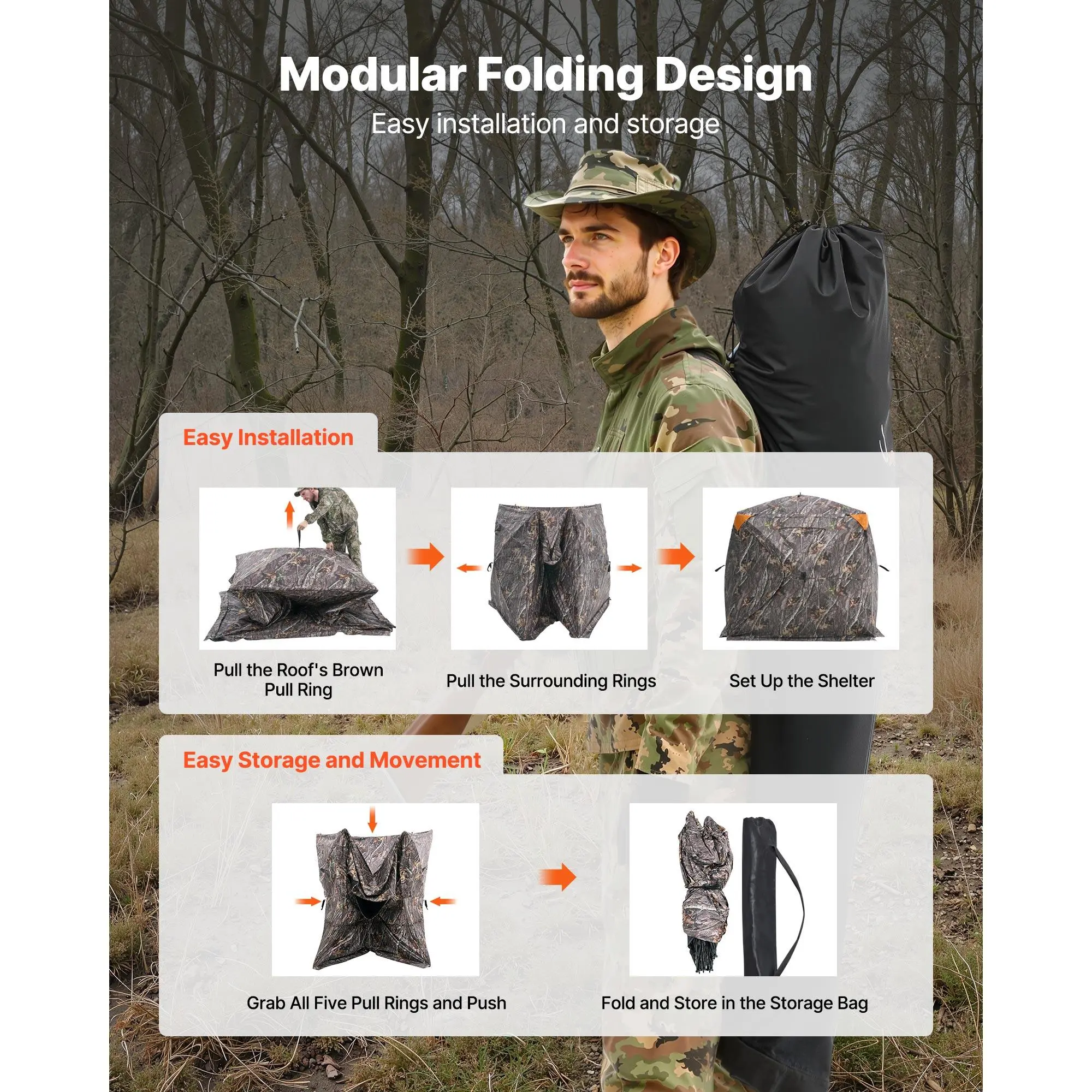 • Silent Hunting Upgrade: The hunting blind uses a silent method with an internal sewn steel bar structure. The door is lockable and zippered, featuring automatic closure. The windows and silent slide rails offers a 270° wide view for easy tracking