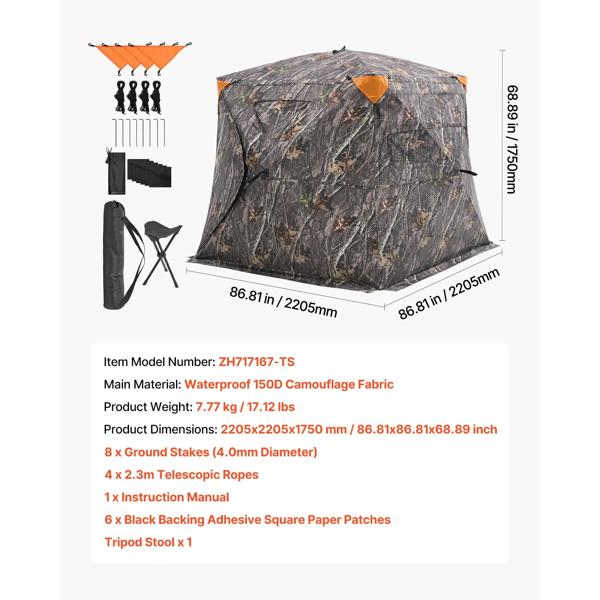 • Spacious Design: Dimension: 71x71x69 in. With large interior, our turkey deer blind tent can accommodates 4-5 people. Diamond-pattern warning fabric is detachable to increase visibility. It provides standing experience, 270°/360° two-way view