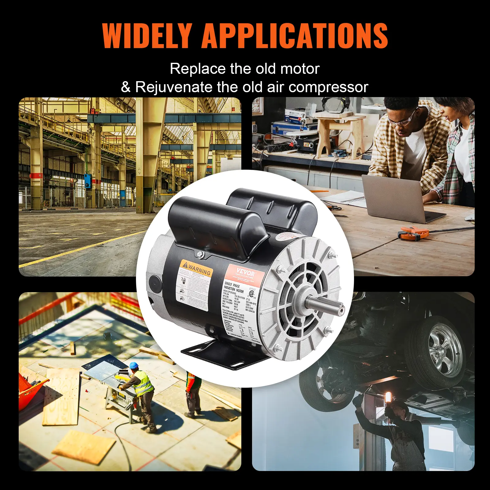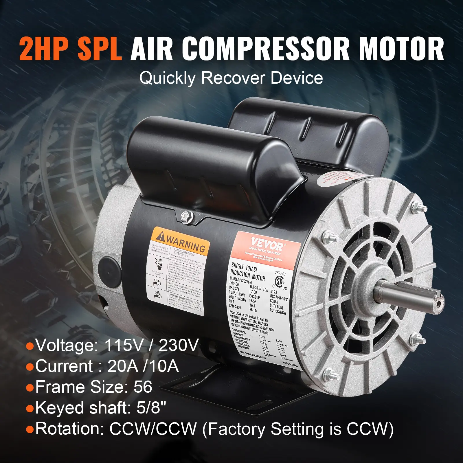 • High Performance: 2HP SPL 3450 RPM, Single Phase, Full Load Amps: 20/10Amp, 115V/230V, SF: 1.0.