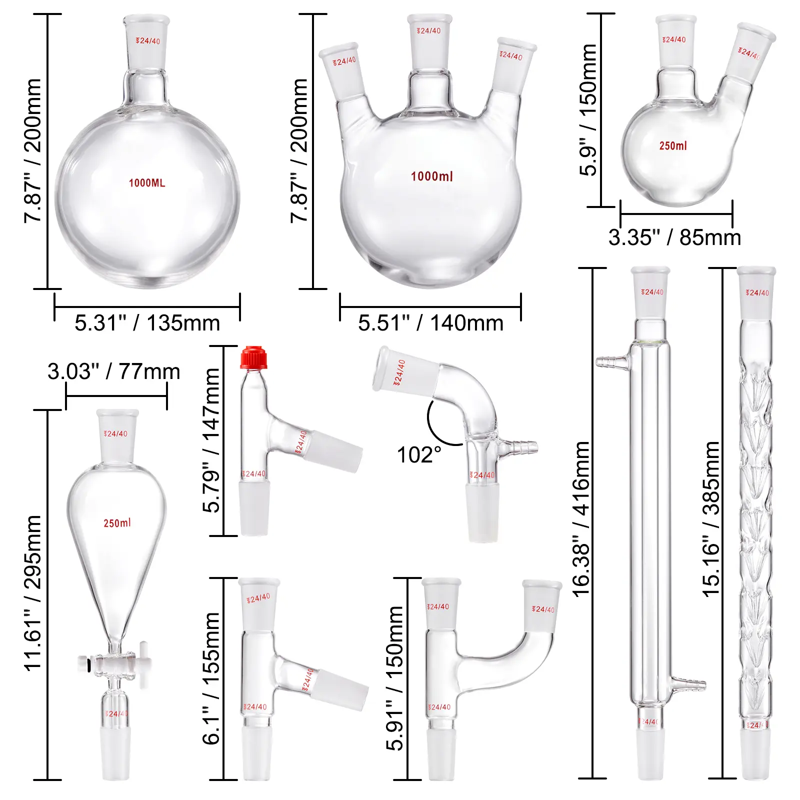 • Standard Ground Joints: All joints are in the standard 24/40 size, allowing easy replacement of different specifications' glassware. They are sandblasted to ensure airtightness and distillation purity.