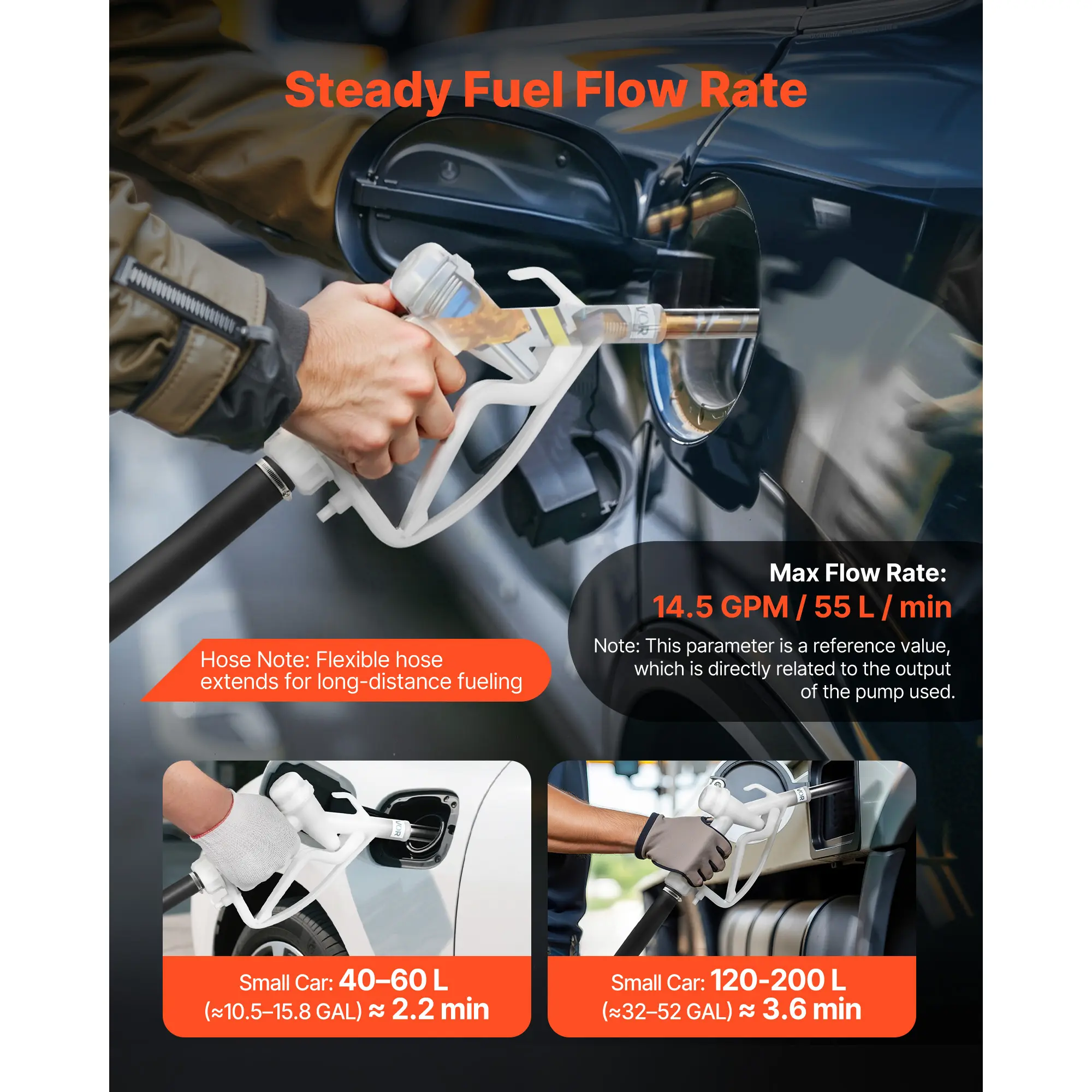 Reaching up to 14.5 GPM, this nozzle provides a stable and time-saving flow rate. Ideal for filling large-capacity fuel tanks, it's a reliable choice for construction sites, trucks, and tractors. Note: Flow rate is reference-based on pump output.