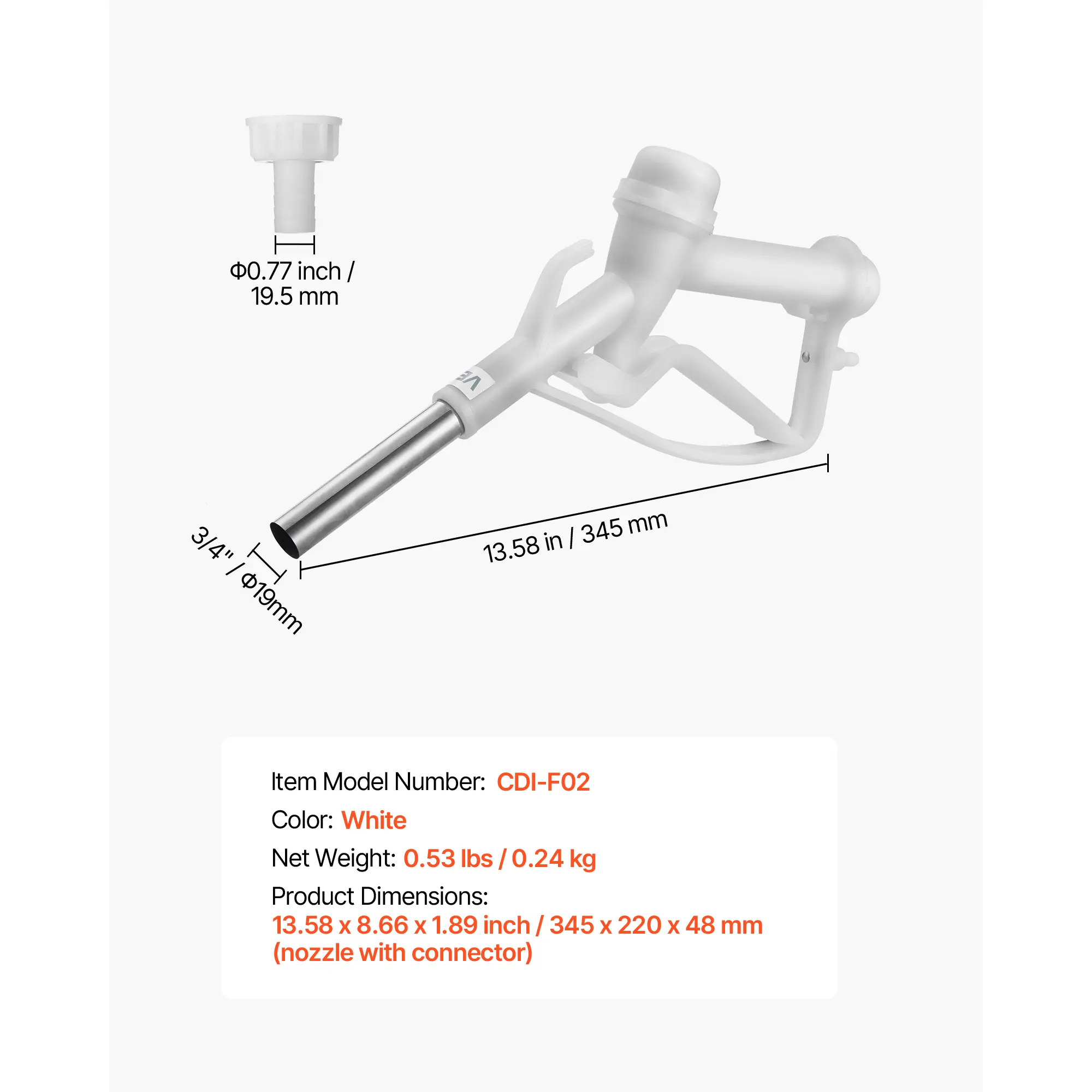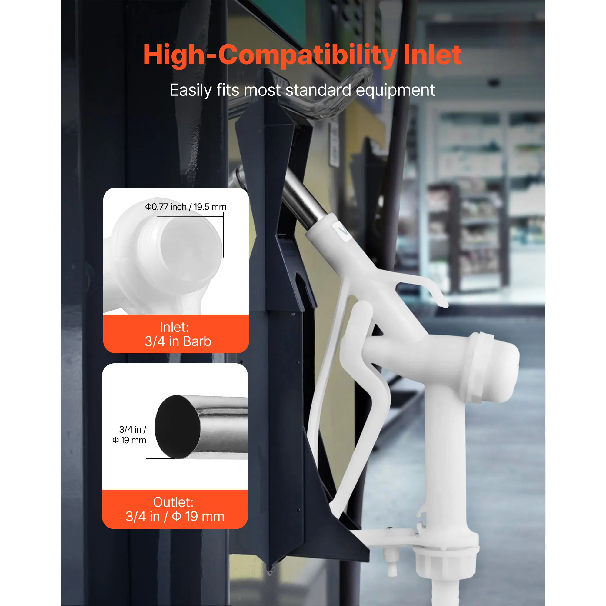 The nozzle features a standard 3/4 in barb threaded inlet, fitting most fuel pumps and systems. It offers quick connections without adapters, perfect for industrial or mobile fueling. This ensures seamless integration into various fuel delivery setups.