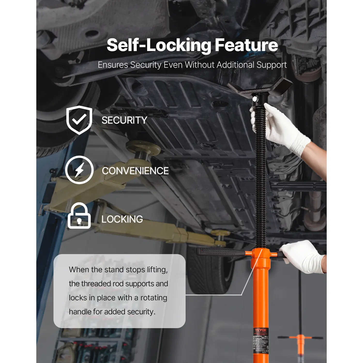 • Self-Locking Feature for Easy Operation: The threaded screw rod provides a self-locking function to prevent the stand from lowering without assistance. Adjusting the under hoist jack stand under the vehicle is also very secure. The rubber handle provides a comfortable grip.