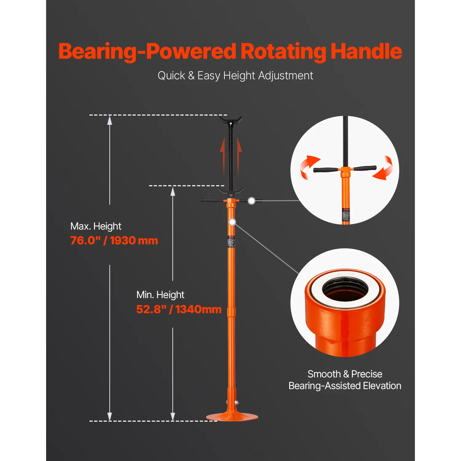 • Bearing Mounted Spin Handle: The spin handle of the jack stand incorporates a thrust bearing, making it easy to raise and lower, even under the extreme pressures of a heavy load. The height adjustment range is 52.8" - 76.0" / 1340 - 1930 mm, catering to the bottom clearance requirements during most maintenance tasks.