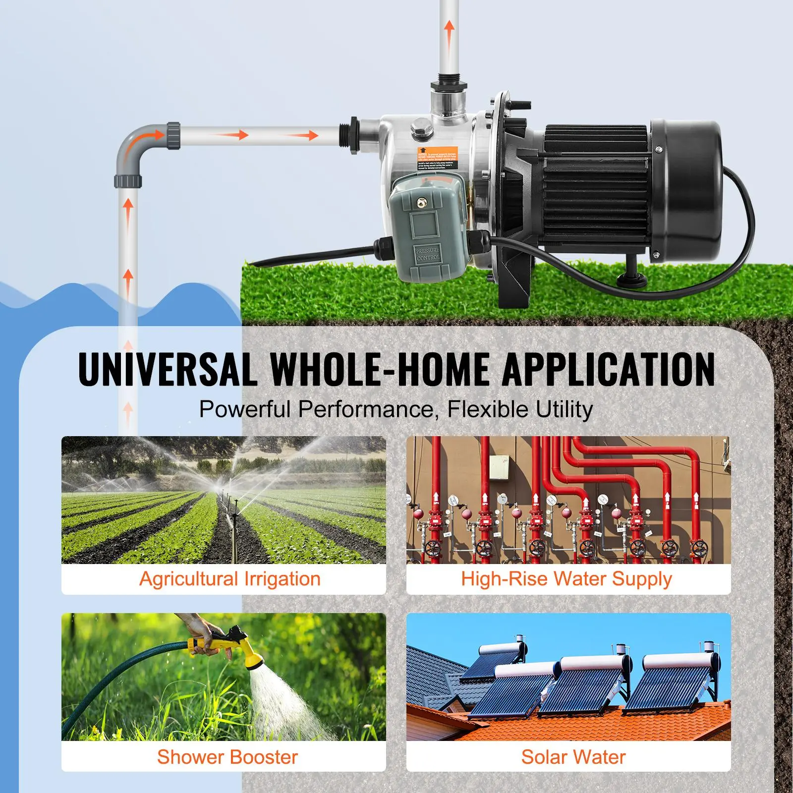 • Commercial & Household Use: This shallow well jet pump is incredibly versatile, perfect for supplying fresh water to large residences, farms, and cottages, while also providing solutions for garden irrigation, boosting water pressure for faucets, supplying water for car washing, and even facilitating high-rise water supply needs.