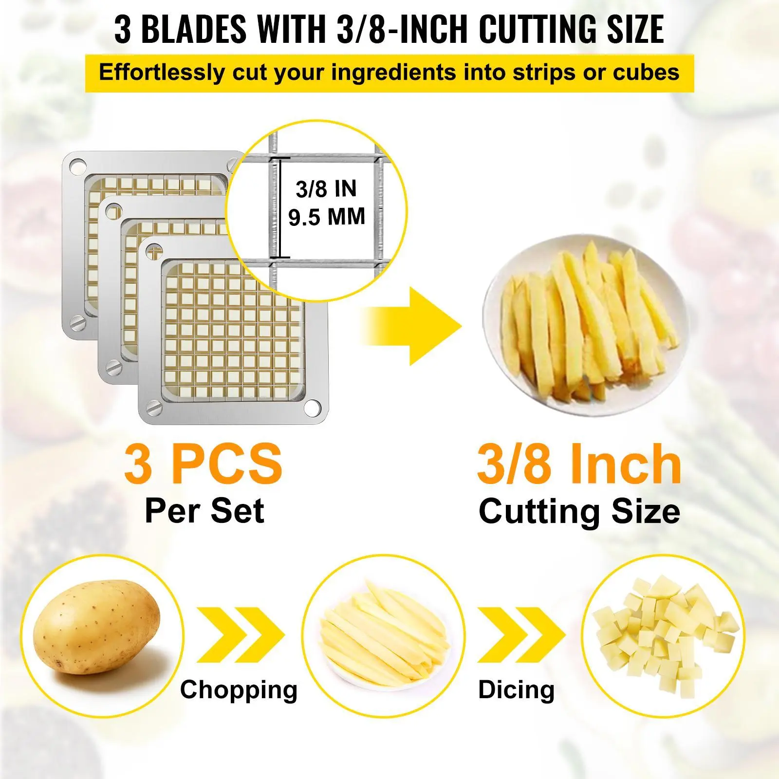 • 3/8-inch Uniform Cutting: Our replacement chopper blades serve to cut the fruits and vegetables into strips or cubes of a uniform 3/8-inch size. Compared with the traditional manual knife cutting, which is laborious and hard to control the cutting size, these chopper blades can greatly save your food preparation time and produce ingredients in perfect uniform sizes.