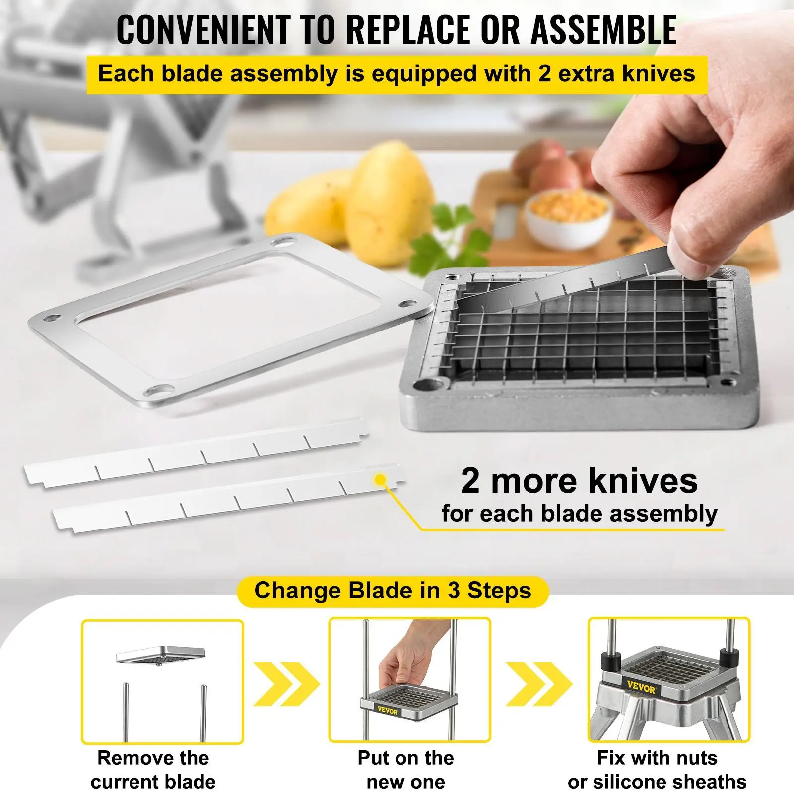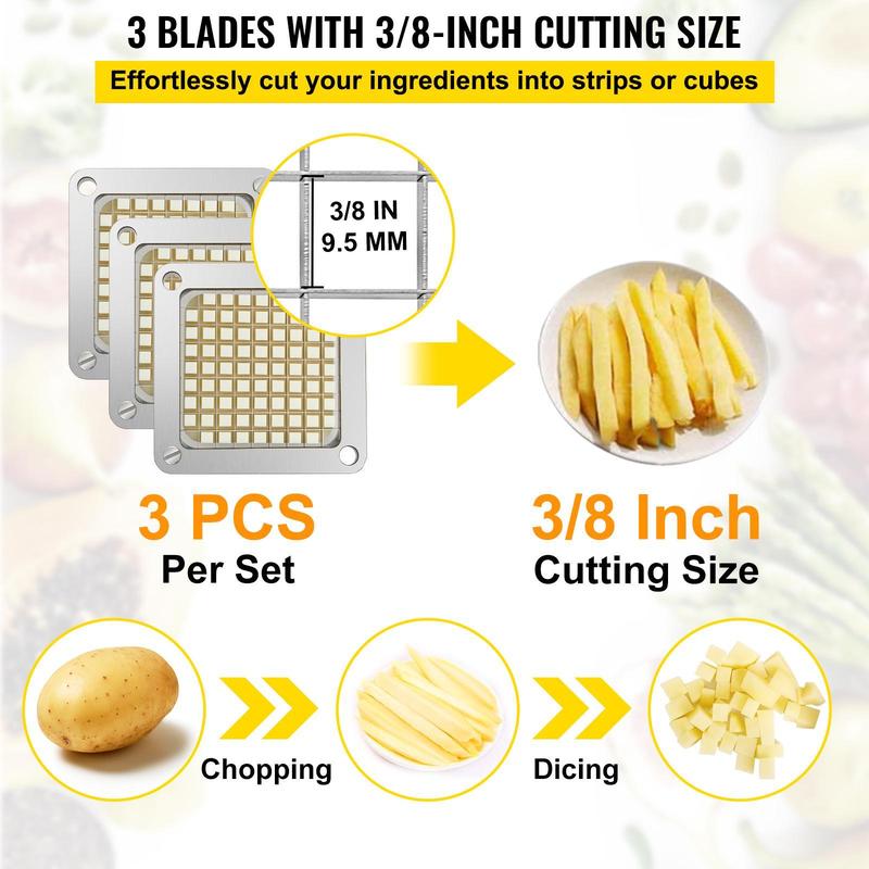• Durable Stainless Steel Blades: The french fry blade assembly adopts durable stainless steel on blades and aluminum alloy on its frame, rust & corrosion-proof and wear resistant. The stainless steel blades are sharp enough for chopping or dicing the vegetable and fruit ingredients.
