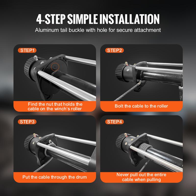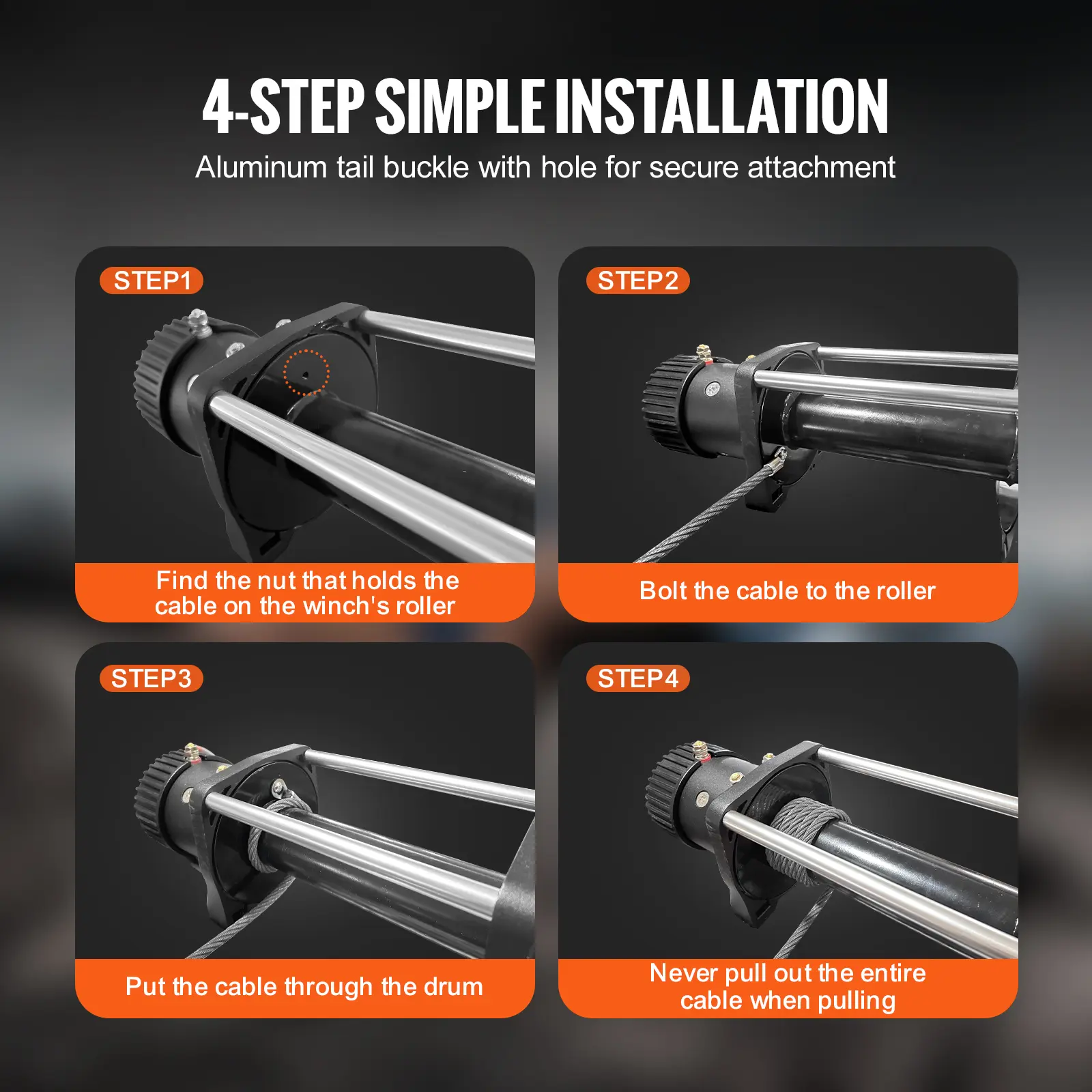 • Simple Installation: Installation's a breeze with our 4-step setup! Just tie, thread, and go – but avoid pulling out the entire winch steel cable during use. To prevent the cable from being cut by sharp edges on the guide plate, we recommend ensuring at least 3/8" to 1/2" of clearance between the opening of the fairlead and the edges of the mounting plate.