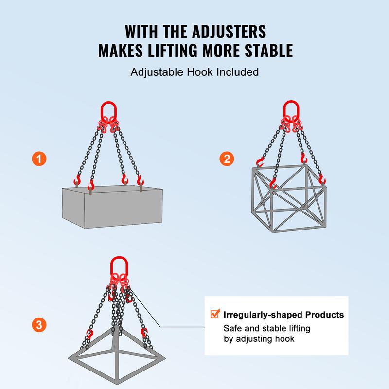 • With Four Adjusters: Our sling chains are equipped with four adjusters, you can adjust the length of the chain through the adjusters. So that it will be safer and more stable when lifting irregular objects.