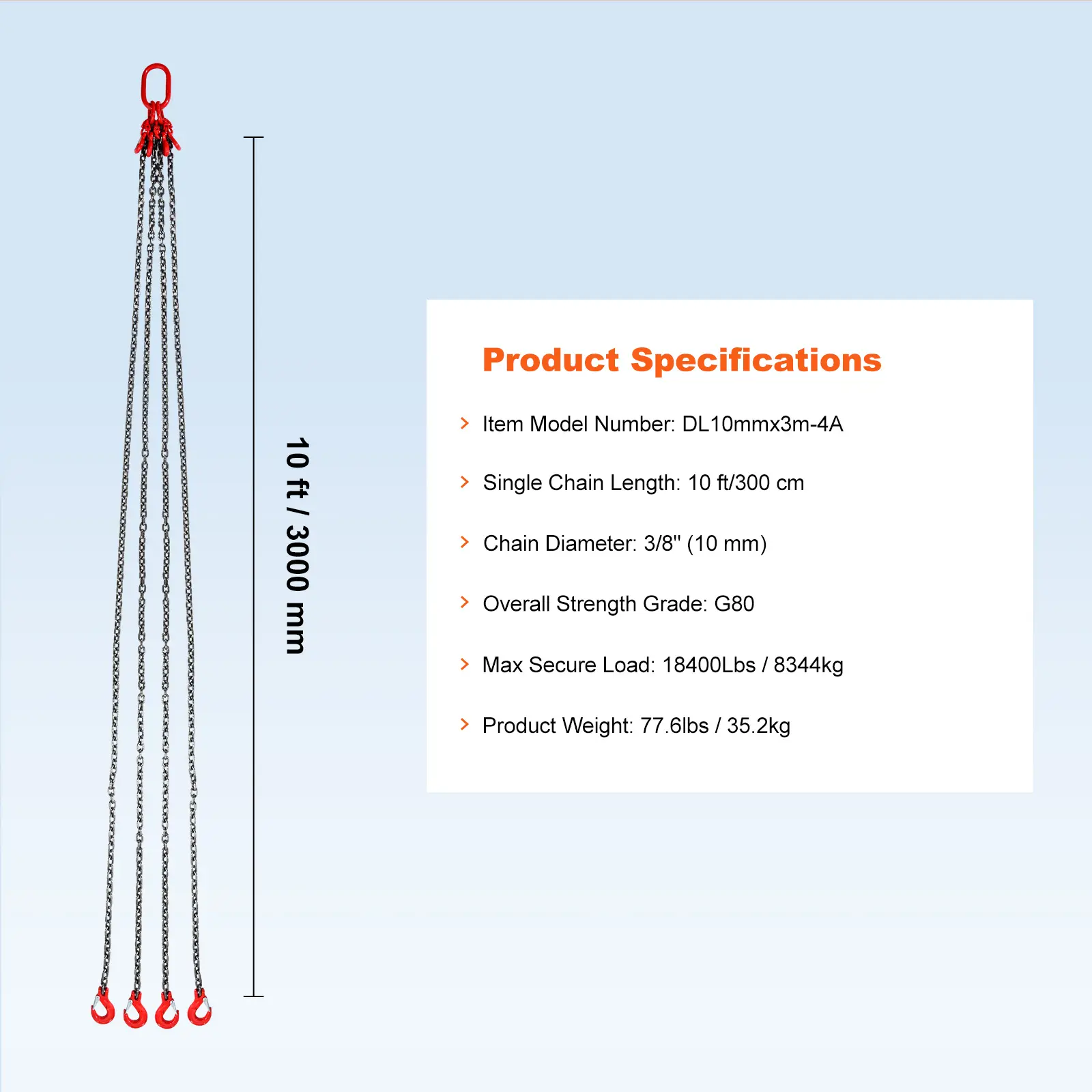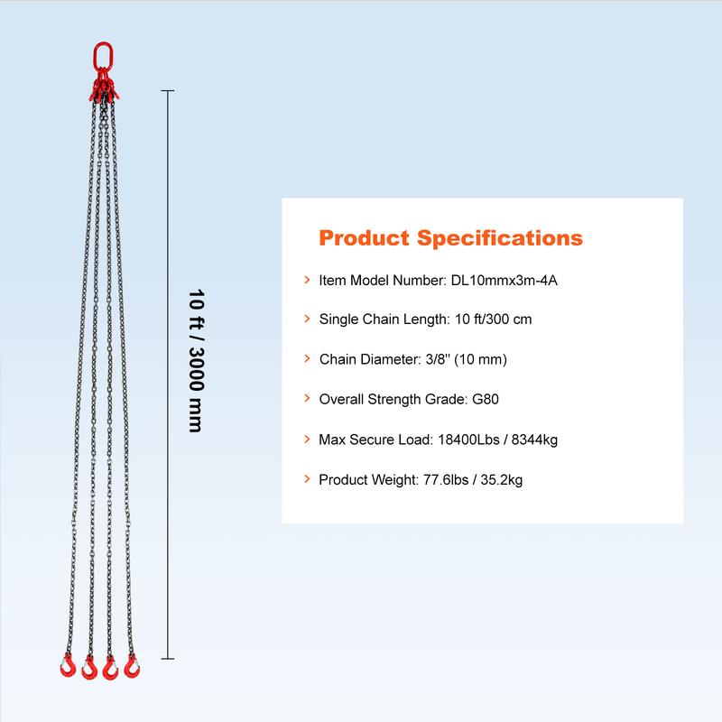 • 18,400 lbs Loading Capacity: Chain Length: 10 ft. Chain Diameter: 3/8". Maximum Working Capacity: 18,400 lbs. You can use our lifting chains at ease with a high-security coefficient.