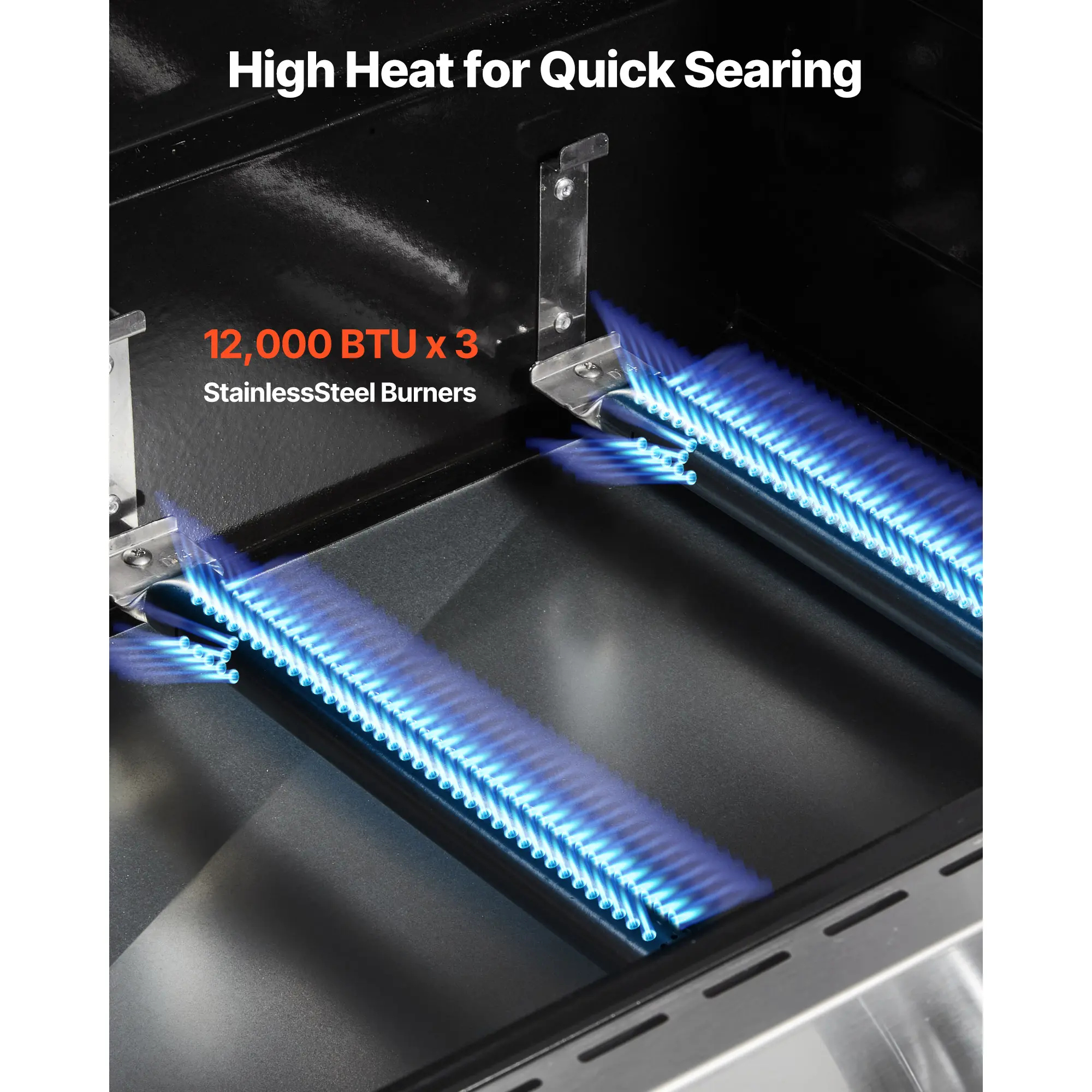 • High-Efficiency Heating: This freestanding propane gas grill runs on a gas cylinder and is equipped with three stainless steel burners, each delivering 12,000 BTUs, for a total of 36,000 BTUs of powerful heat. It provides fast, even heating—whether searing meat or quickly grilling vegetables—so you can serve large gatherings without long waits