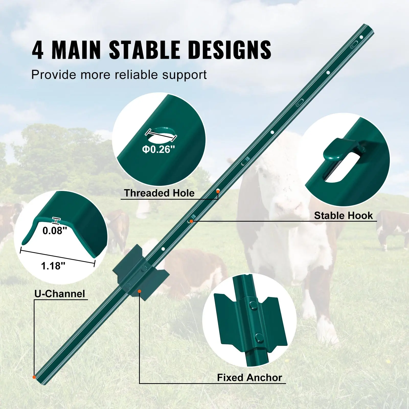 • Sturdy & Durable Fence Post: Made from 2 mm (0.08") thick Q235 carbon steel, this fence post offers high strength and rigidity. The U-shaped channel design improves bending resistance, while the powder-coated finish provides UV protection and corrosion resistance, ensuring durability in all weather conditions.