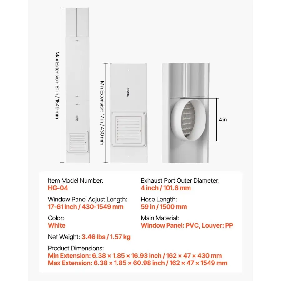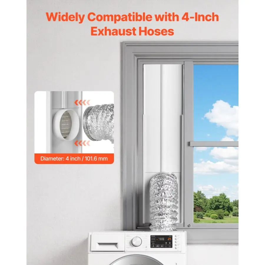 VEVOR 3 - in - 1 Indoor Dryer Vent Kit, with Bucket for Electric Dryer with 4 - Inch by 5 - Feet Extendable Exhaust Hose, Premium Quality Light Weight No Extra Accessories Required for Apartments, RVsVEVOR Dryer Vent Window Kit, Fits 4-Inch Exhaust Hoses, Adjustable Length for Adapts Sliding Windows of Different Heights, Sturdy PVC and PP Materials, Dual Protections & Multi-layer Sealing Design