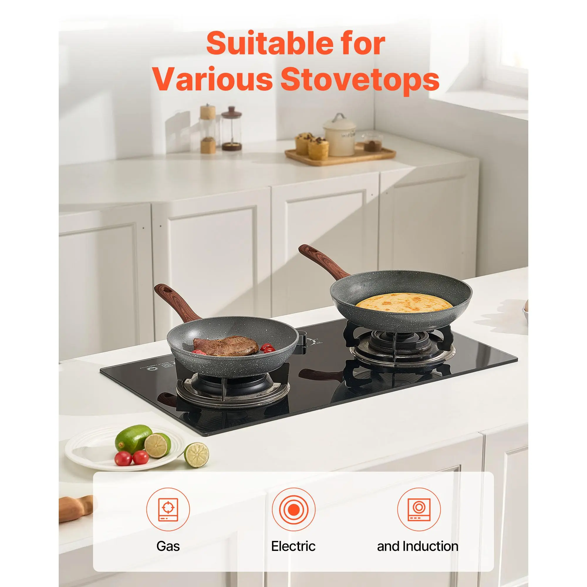• Works with All Cooktops: Suitable for frying, searing, steaming, simmering, baking, and stir-frying. This skillet set is compatible with gas, electric, and induction stoves for added cooking flexibility
