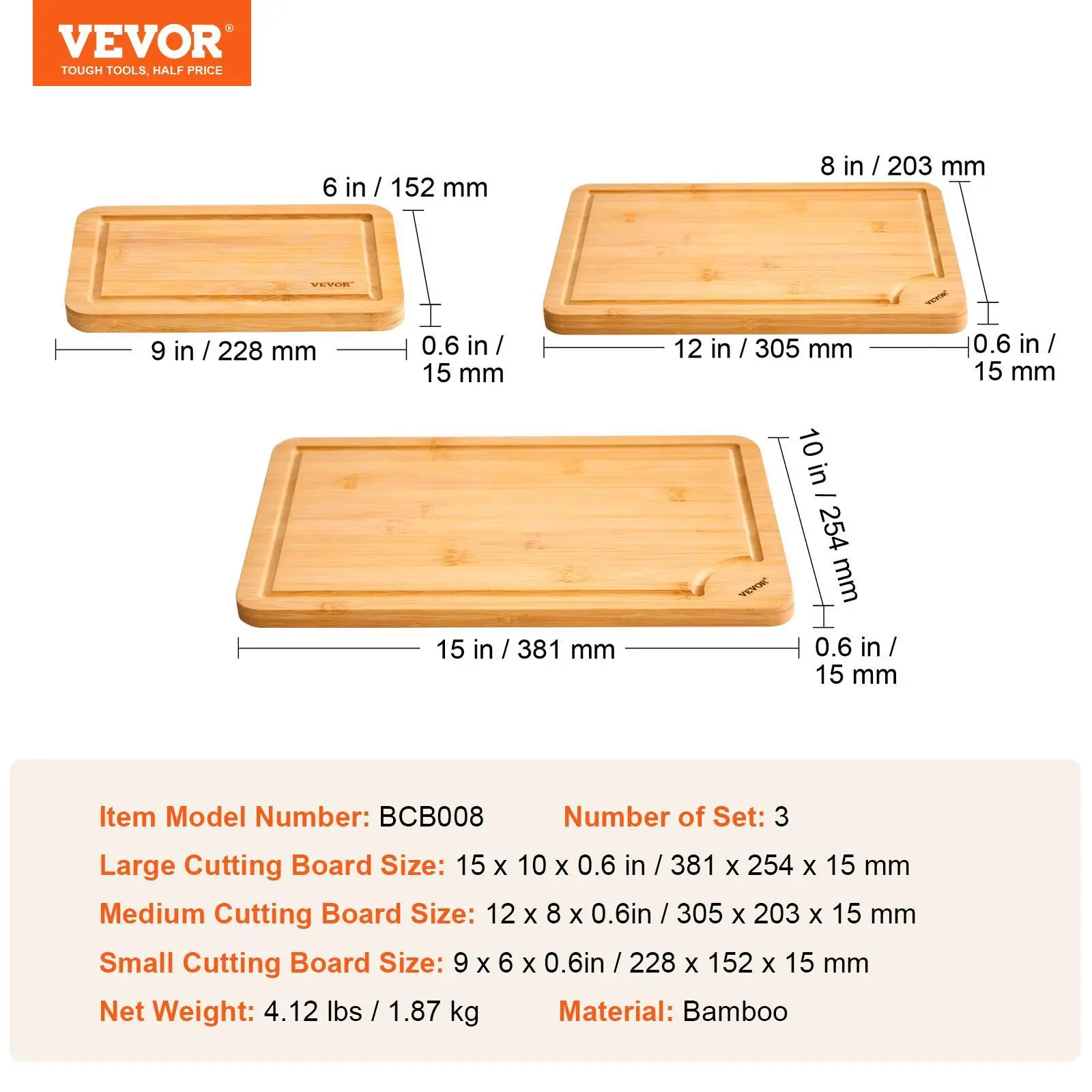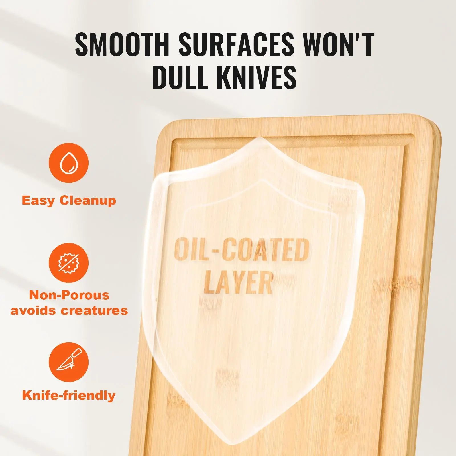 • Natural Bamboo Material: Made from sustainable bamboo, this cutting board set is durable. The 0.6 in / 15mm thickness ensures long-lasting use, maintaining its flatness and withstanding warping, making it a dependable choice for your kitchen.