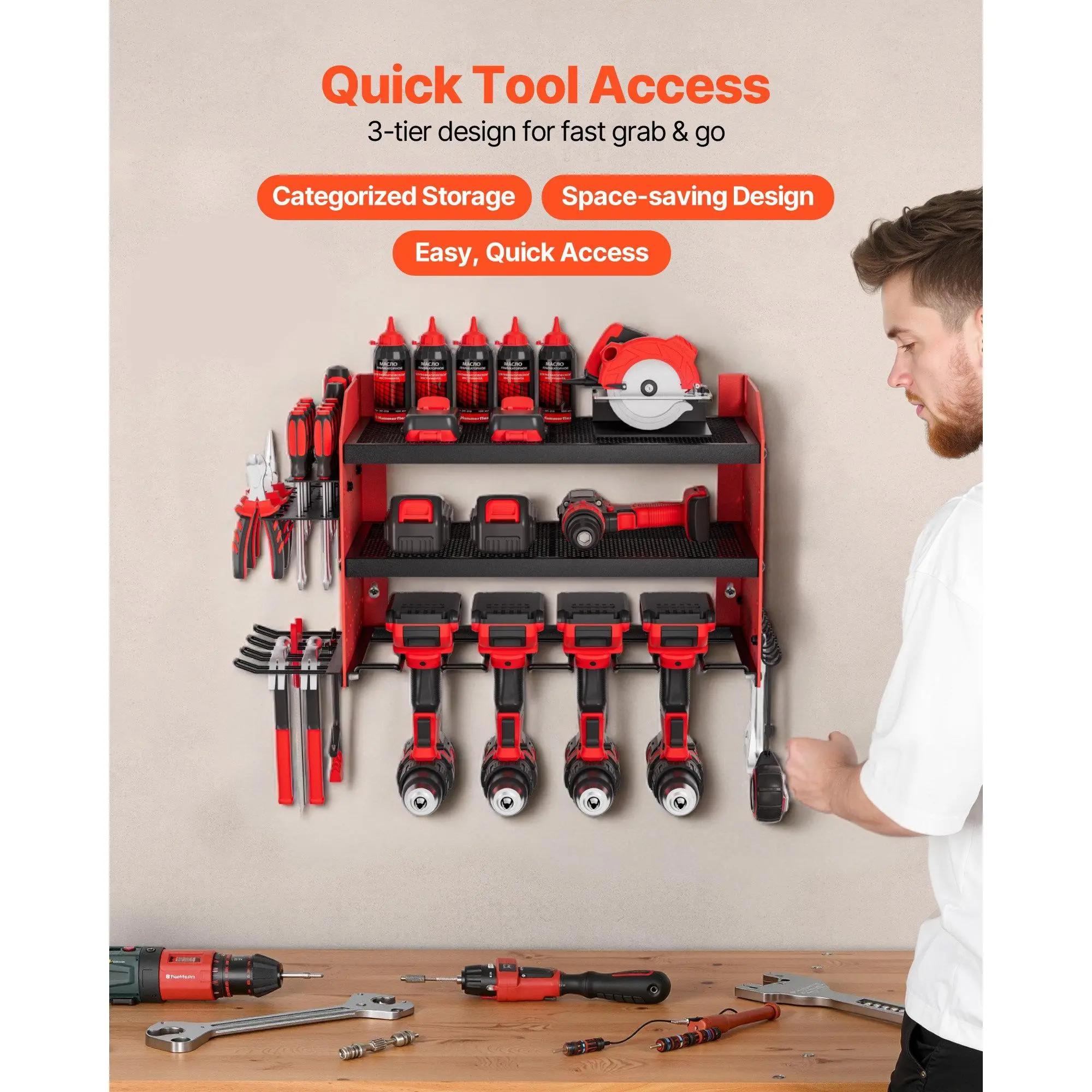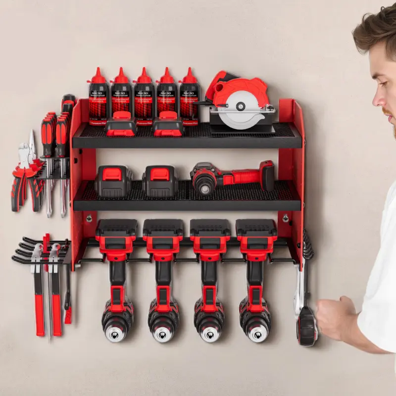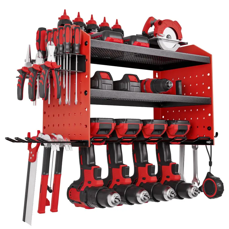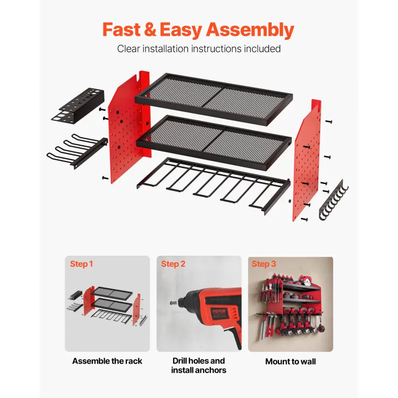 Efficient Storage: This 3-tier wall-mounted power tool rack (23.31 x 8.66 x 12.01 in) has an adjustable middle shelf, 4 drill slots, pegboard sides, hooks, and holders to keep tools neat and handyAdjustable Shelf Height: Spacious adjustable shelf of our power tool organizer fits large batteries and bulky tools. Raise or lower it to match your needs, doubling your storage efficiency in secondsPegboard Side Design: Dense 0.24-inch peg holes of the hanging tool organizer fit various accessories.Store drills, hammers, screwdrivers, wrenches, and more-all within easy reach when you need themSturdy & Durable: Premium carbon steel frame of the power tool storage rack supports 100 lbs total (33 lbs per tier).Powder-coated finish resists rust, and mesh shelves improve airflow to keep tools coolEasy to Install: Our drill organizer includes mounting hardware and simple instructions. Fits concrete, brick, wood, and stud walls. Ideal for workshops, garages, or as a present for DIY loversVEVOR Power Tool Organizer Wall Mount, 3-Layer Storage Rack with 4 Drill Holders, Tools Holder and Storage Rack with Side Pegboards, Garage Tool Organizer for Garage, Workbench, and Workshop