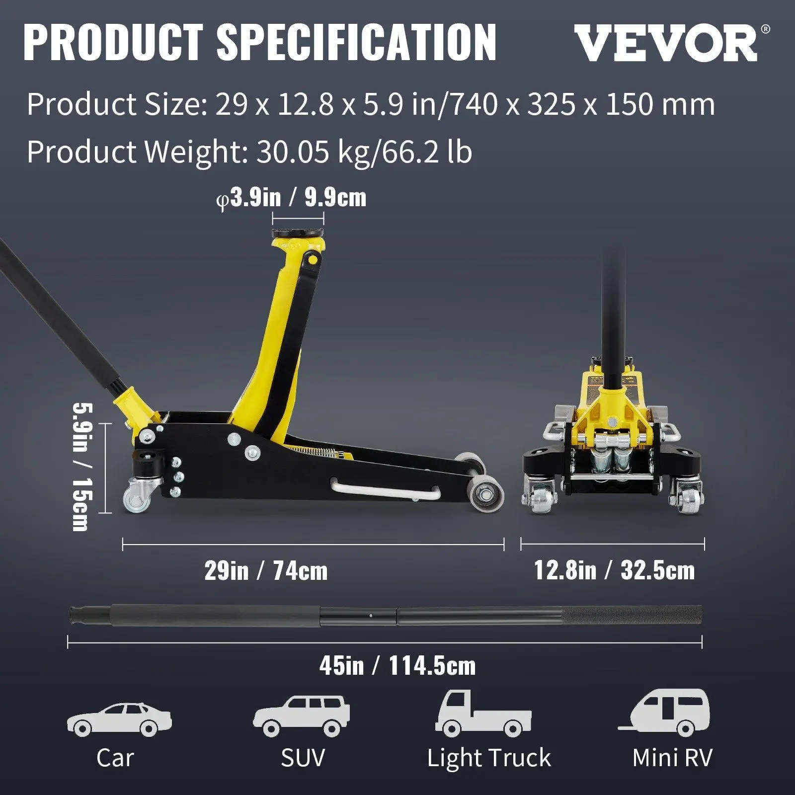 ·Secure and Carefree: A rubber saddle and a foam handle bumper provide maximum protection to your vehicle! The 360° rotatable saddle can be detached and replaced. Thanks to the leverage principle, the 45" long handle makes lifting easier. With the two-piece design, the handle can be disassembled when stored, taking up little storage space.
