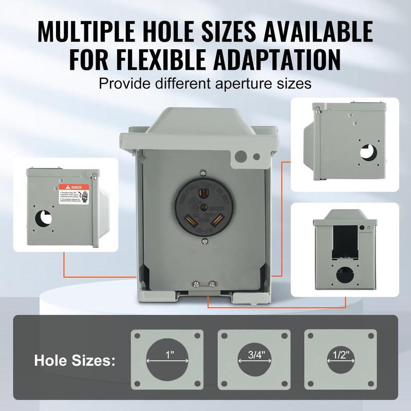 • High Compatibility: Our outdoor rv receptacle comes with pre-knocked holes and three different aperture sizes so that users can choose the appropriate size, ensuring a secure connection and providing more stable and reliable power access.
