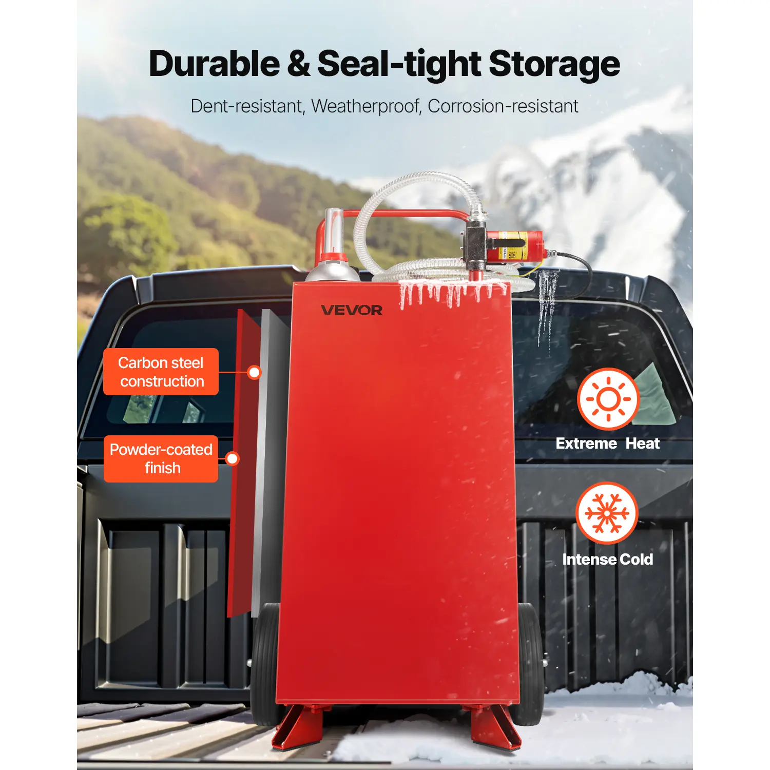 • Durable & Sturdy: Built with high-strength carbon steel, this gas storage tank withstands dents, corrosion, and the elements. Whether it's sunny or rainy, it keeps your fuel securely stored and secure for long-term use, even in the harshest environments.