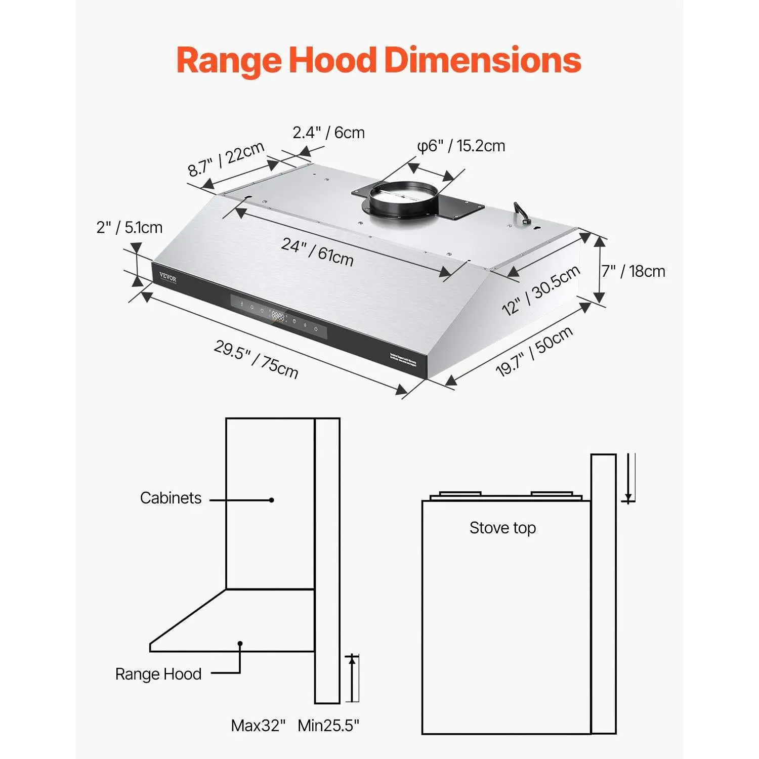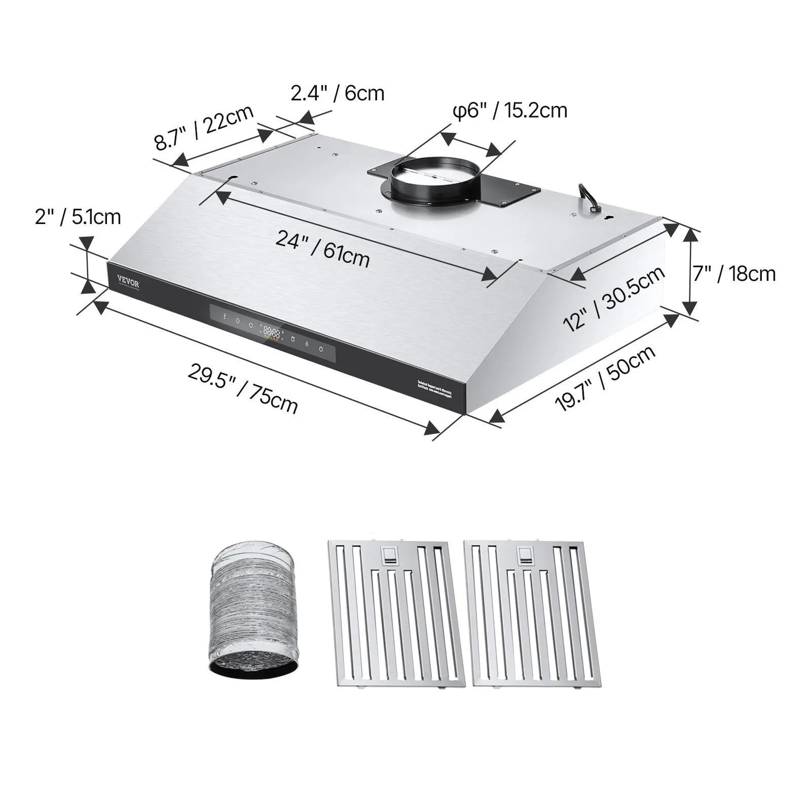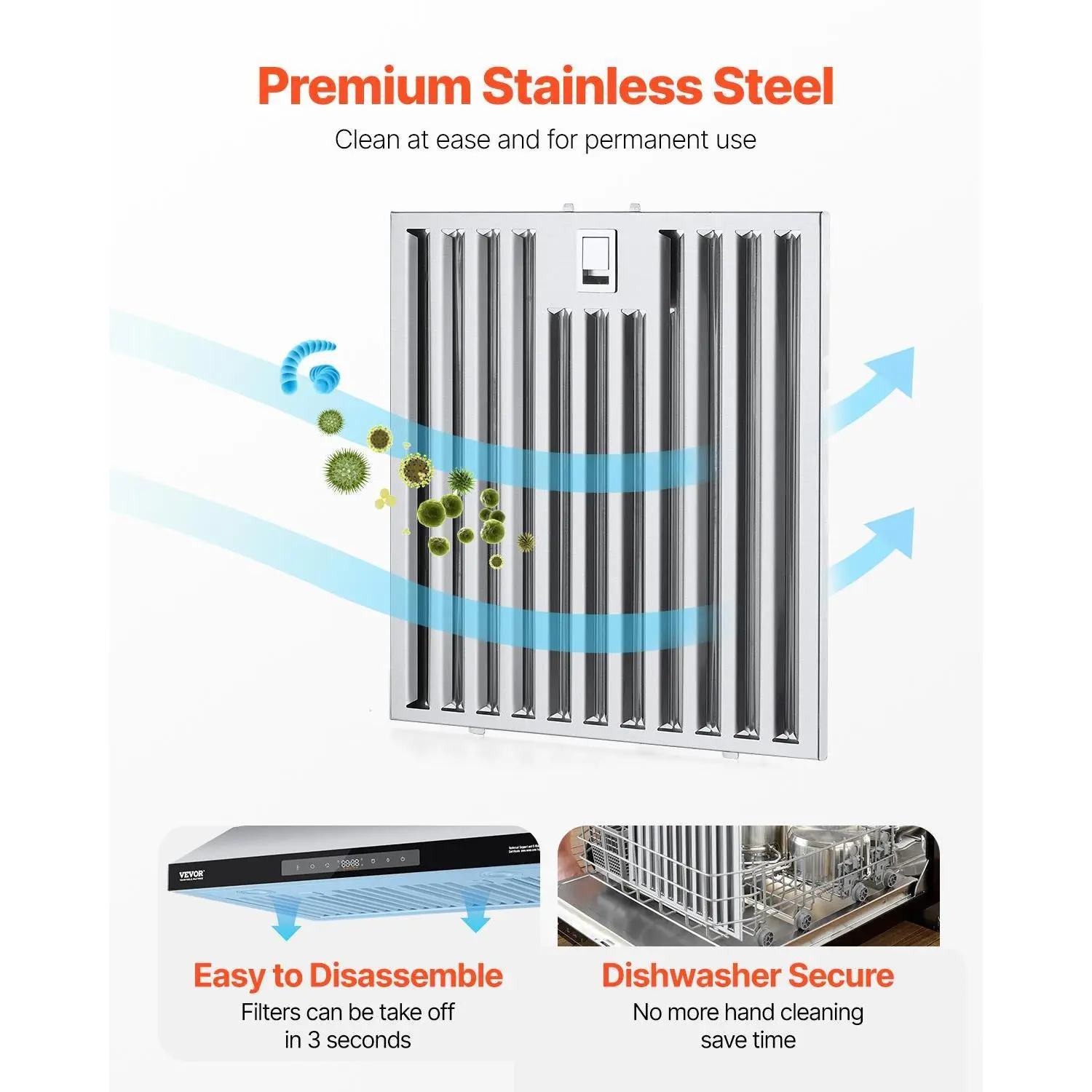 • Premium Stainless Steel: Crafted for durability and ease of maintenance, the vent hood features stainless steel. Its 2 detachable filters effectively capture grease and oil, and are dishwasher safe, making cleanup a breeze.