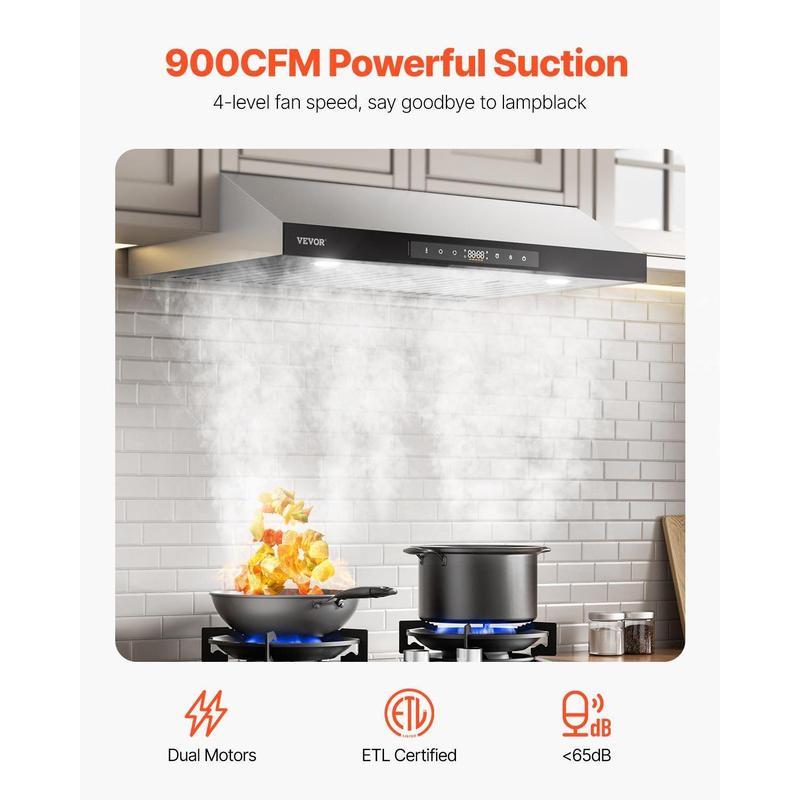 • 900CFM Powerful Suction: Enjoy efficient air purification with our under cabinet range hood's robust 900 CFM airflow. Featuring dual motors and a 4-level fan speed control, it effectively eliminates smoke and odors from your kitchen while maintaining a quiet operation of less than 65dB. ETL certified for safety and performance.