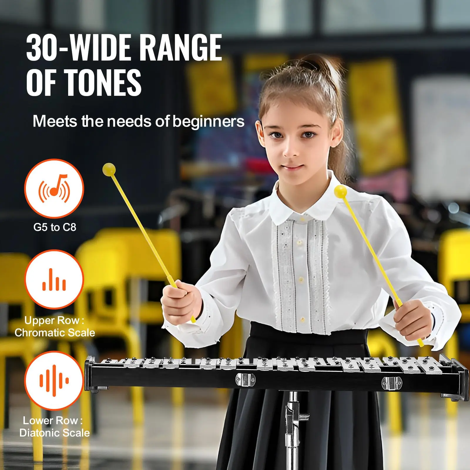 • Professional 30 Note Xylophone: The professional 30 note xylophone boasts a range from G5 to C8, comprising 30 distinct notes organized into two rows: one for semitones and the other for whole tones. Crafted with precision using advanced spray painting techniques, it delivers crisp and rich tones. Each aluminum bar undergoes professional tuning, with clear note markings for easy identification.