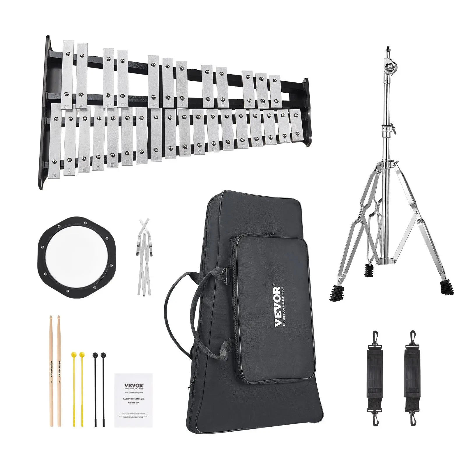• Comprehensive Package: The glockenspiel xylophone bell kit includes: 30 Note Xylophone x1, Carrying bag x1, Adjustable stand x1, Music stand x1, Practice pad x1, Mallets x4, Drumsticks x2, Instruction manual x1, Clamp x2; the 8-inch practice pad provides a realistic drumming experience; the electroplated music stand with a stable structure and clamp combination aids in securing music sheets for comfortable daily practice, making it suitable for manual use.
