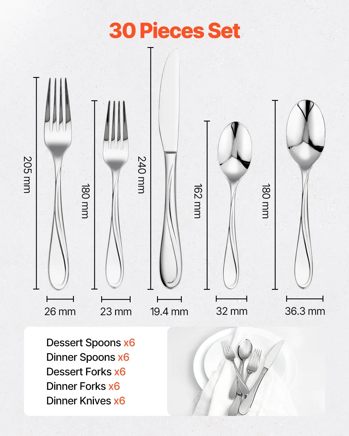 ·Set Contents: 30 pieces, including knives, forks, and spoons.
