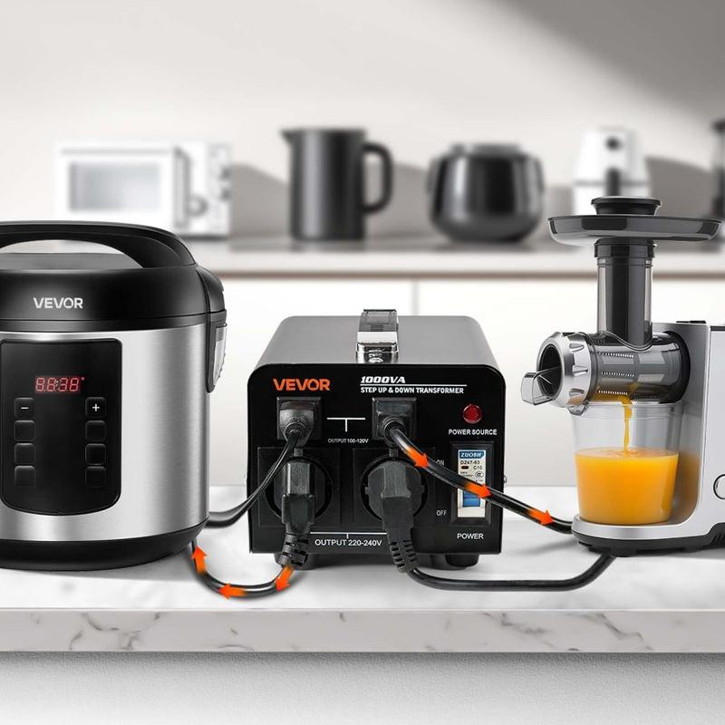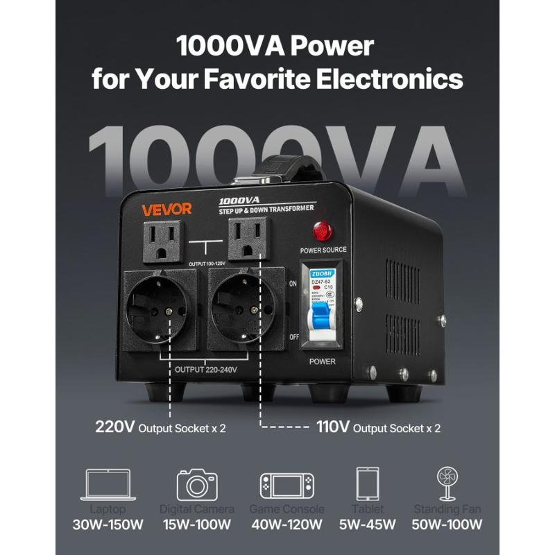 VEVOR Voltage Auto Converter Transformer, 3000VA, Heavy Duty Step Up/Down Power Transformer, 110V to 220V and 220V to 110V, with 3 US Outlets, 3 EU Outlets, LCD Display, Circuit Breaker ProtectionVEVOR Voltage Converter Transformer, 1000VA, Heavy Duty Step Up/Down Power Transformer, Convert from 110V to 220V and 220V to 110V, with US Outlets, EU Outlets, Power Cord, Circuit Breaker Protection Easy-to-Grip Handle Rounded Corners Non-Slip Feet Durable Metal Housing Easy to
