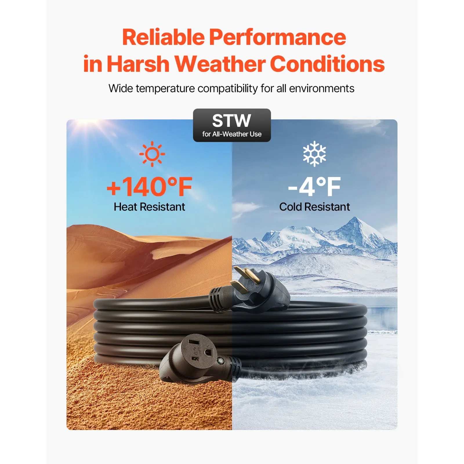 • Weather-Resistant Durability: With an SWT insulation rating, this generator power cord is built to withstand harsh weather conditions, including rain, humidity, and intense sunlight. Whether you're working outdoors or need to extend power indoors, it ensures reliable performance in all environments