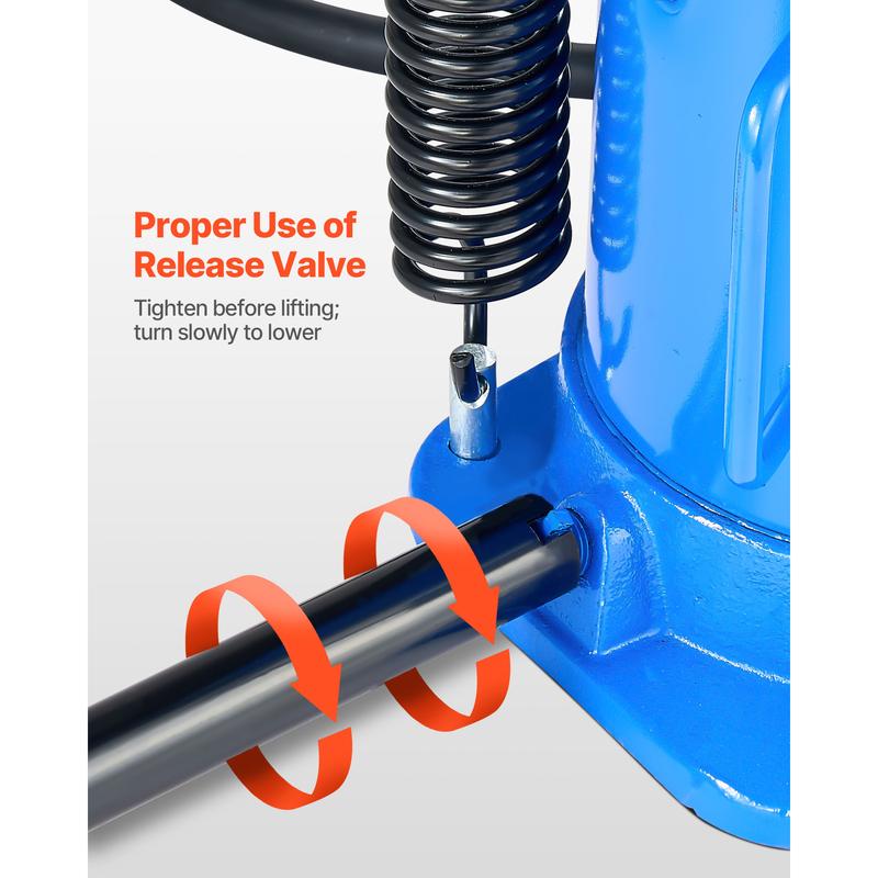 • Protection Design: The bottle jack's aluminum cylinder seals tightly for lasting performance. A built-in valve helps avoid overload, and the oil fill port stays leak-free. Dual springs reset the piston quickly, so you're ready for the next job