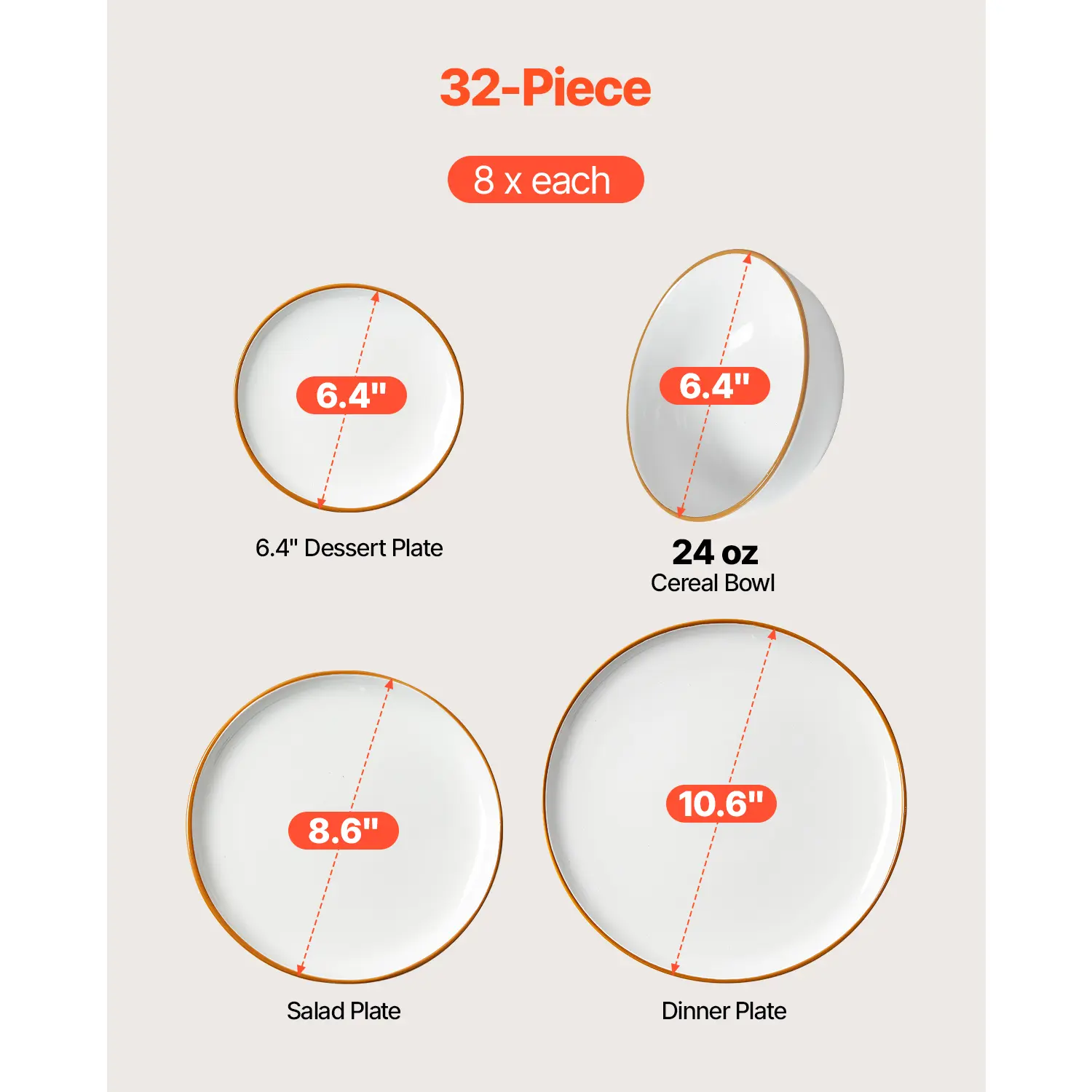 • Essential for 8-Person Families: This 32-piece dinnerware set includes 8 x 6.4 in bowls, 8 x 8.6 in salad plates, 8 x 10.6 in dinner plates, and 8 x 6.4 in dessert plates, ideal for daily meals and gatherings. It also makes nice housewarming gift