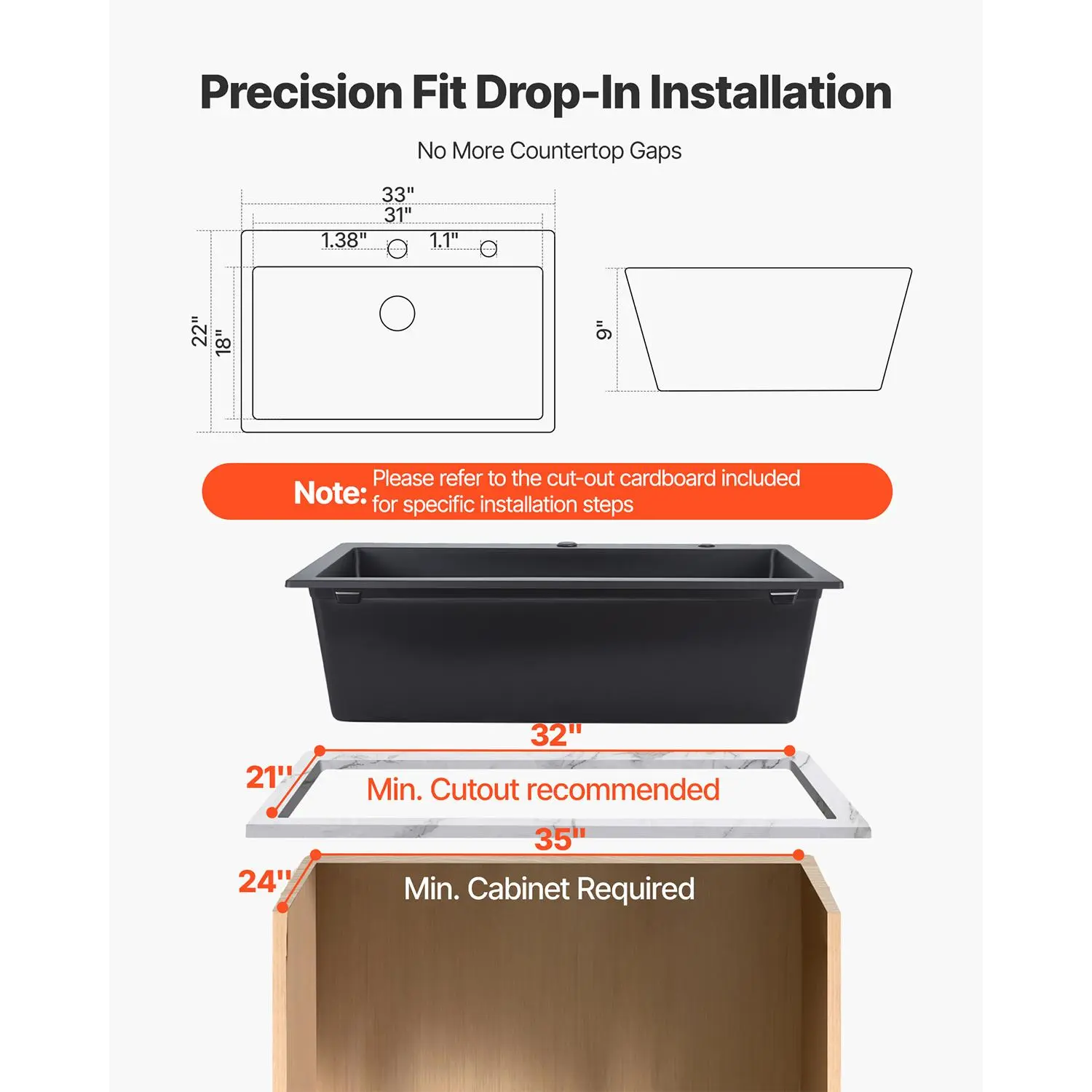 • Precise Template Installation: The drop-in basin fits cabinets as small as 35x24 inch with 32x21 inch recommended cutout. Includes a template for precise prep kitchen sink alignment. Follow the guide for single bowl kitchen sinks setup