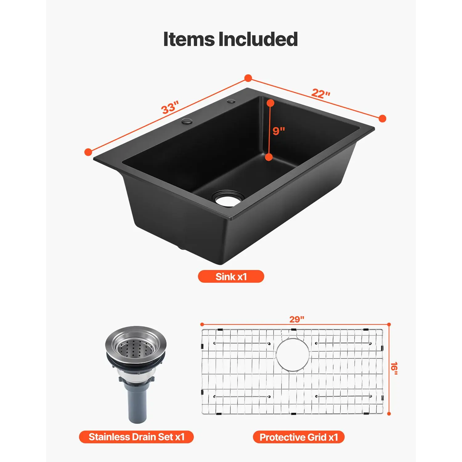 • Arrives Intact & Complete: The small kitchen sink is shielded by double-wall cartons, EPE foam, passed stacking/vibration/drop tests. Includes: Granite Kitchen Sink x1, Drain Set x1, Grid x1, Parts Set x1, Hole Template x1, Manual x1