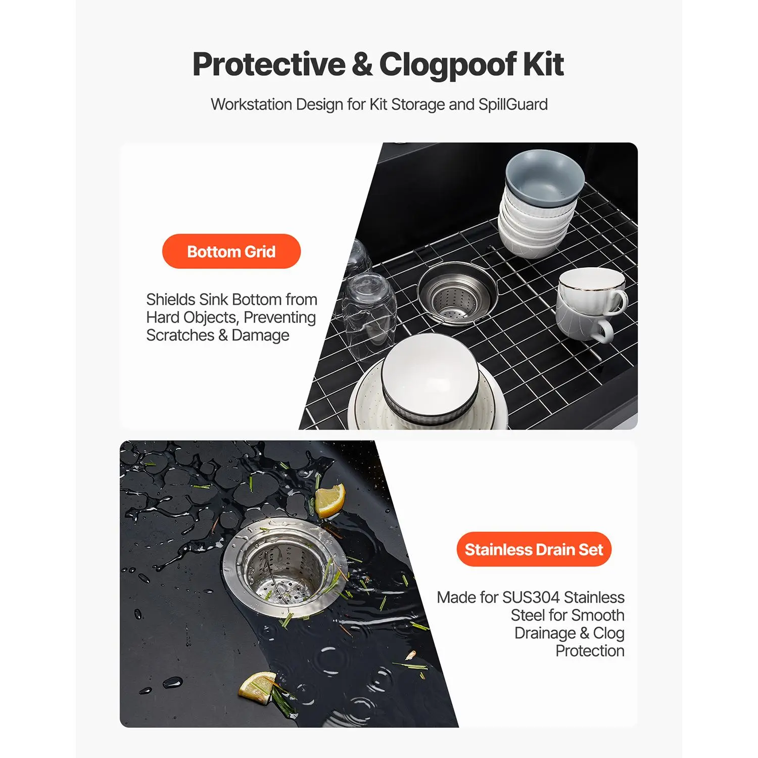 • Multi-Part Kit for Granite Kitchen Sink: Grid reduces scratch and dampens noise; drain kit with filters catches debris for rapid water flow; silicone stopper forms a tight seal, keeping the top mount kitchen sink fresh and cutting standing water